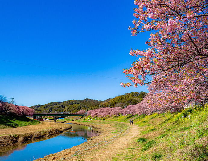 この河津桜を愛でるイベントが、毎年2月上旬から下旬にかけて、約1か月間開催される「河津桜まつり」です。河津川沿いを中心に、約八百五十本の桜が植えられています。河津町全体では約八千本もの桜が咲き、町が桜の色に包まれます。開花時期が長く、色鮮やかな桜は満開でなくても十分見ごたえがあるので、ゆったりと計画を立てられるのも、うれしいポイントです。