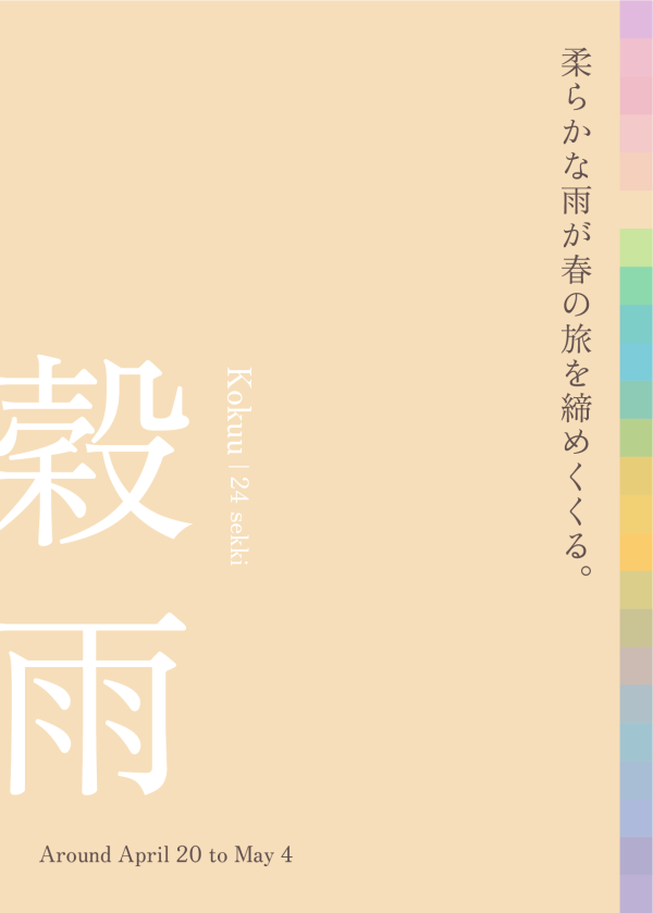 変わりやすく気まぐれだった春の気候が落ち着いて日差しがだんだんと力強く感じられるようになると二十四節気で「穀雨」と呼ぶ晩春を迎えます。この時期より後に降る雨が、大地の穀物をたくましく育てるようにと願いのこもったことばの通り、米どころで始まるのは田植えの準備。八十八夜を迎えた茶畑で新茶の収穫が盛んになるともうすぐ夏がやってきます。