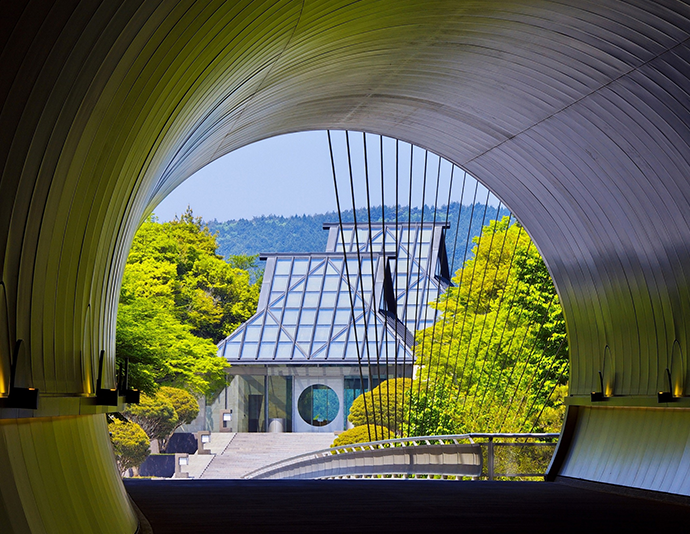 また、信楽を訪れるなら、ぜひ観ておきたいのがMIHO MUSEUM。創立者である小山美秀子さんが40年以上かけて集めた、多彩な日本美術とともに世界の古代美術などのコレクションが所蔵されています。2世紀後半に作られたとされる、ガンダーラ仏立像などの仏教美術も必見。また、ルーヴル美術館のガラスのピラミッドを手掛けたI.M.ペイ氏による、自然との調和をテーマとした建築美も見どころです。特にエントランスへとつながる銀色に輝くトンネルは、まるで別世界へといざなわれるかのよう。