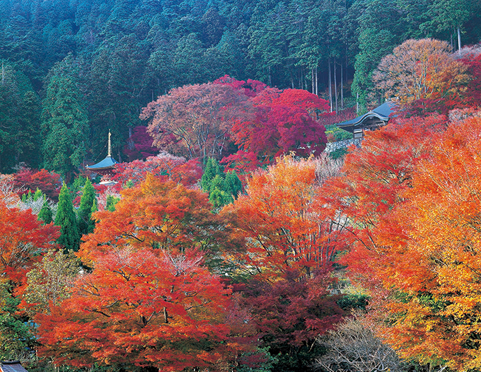 油山寺は、目の霊山として有名なお寺です。孝謙天皇が眼の病にかかった際、本尊の薬師如来に眼病平癒を祈願し、滝の水で眼を洗ったところ病が完治されたといわれ、現在も「るりの滝」として見ることができます。また、1,500本と三山の中では一番モミジが多く、山門や参道を覆いつくす赤や黄、緑色の見事なグラデーションを楽しめます。