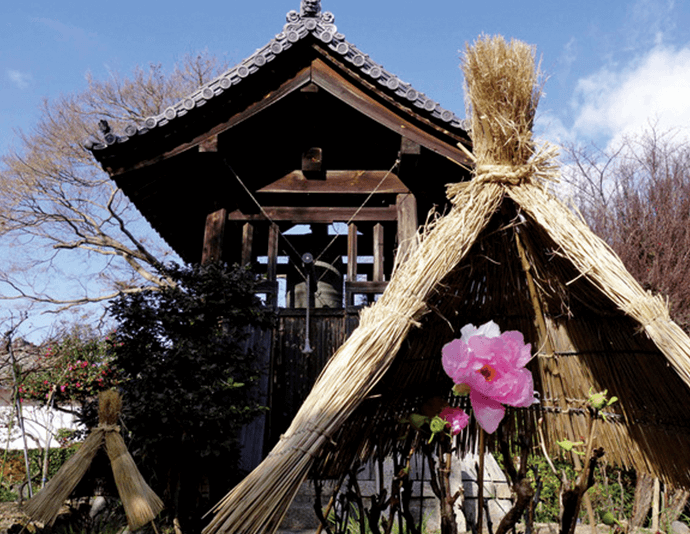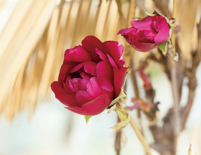 美しい人やその立ち居振る舞いを「立てば芍薬、座れば牡丹」と表現するように、古来から愛されてきた花。寒牡丹は繊細なため、菰(こも)に守られて育ちます。春の陽気の中で艶やかに咲く牡丹も、もちろん魅力的。ですが冬の寒さに耐えて咲く寒牡丹が菰からそっとのぞく姿は、なんとも健気で胸を打たれます。