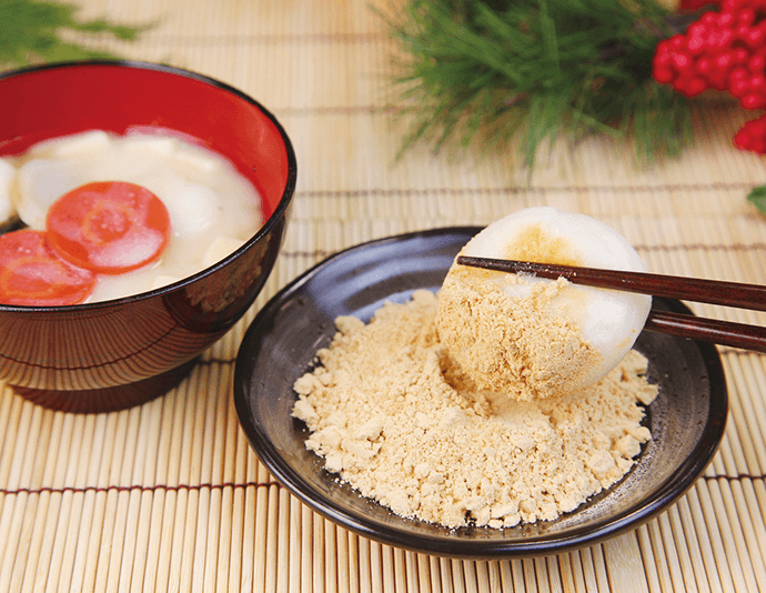 奈良の「きなこ雑煮」は、白みそ仕立てのお雑煮で、汁を吸った餅をきな粉につけて食べます。具材は蔵が建つように四角に切った豆腐やこんにゃく、丸く一年を過ごせるように丸餅や輪切りした大根、にんじんを入れます。