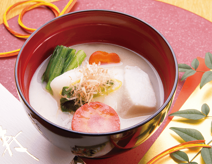 まずお餅でいうと、岐阜県関ヶ原あたりを境に東日本は角餅、西日本は丸餅に大別されます。汁も餅と同じく岐阜あたりを境に東はすまし汁仕立て、西は味噌仕立てが主流です。具材は、野菜や鶏肉、魚介、豆などその土地の食材をはじめ、縁起物やだじゃれのような具材などバリエーション豊かです。