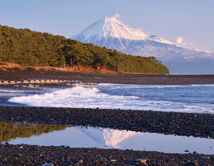 三保松原(静岡市清水区)は、海岸に生い茂る松と白波立つ駿河湾の青い海、富士山で構成される日本屈指の景勝地。その美しさは和歌や浮世絵などに表現されてきました。海越しに見る初日の出、それに照らされて赤く染まった富士山に神々しさを覚えることでしょう。