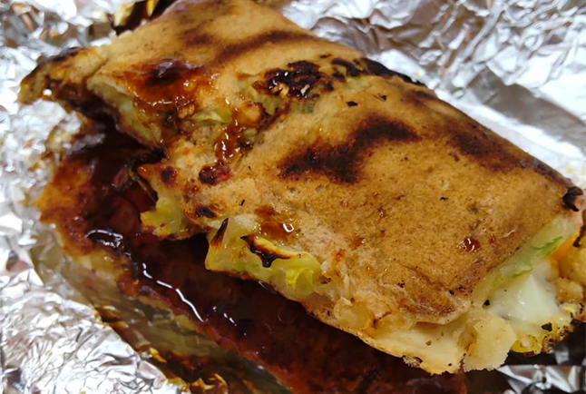 「名古屋風お好み焼き」は、キャベツや豚肉などの具材を薄い生地で焼き、半分に折って銀紙と包み紙にくるんだご当地グルメです。「お好み焼き甘太郎」(西区)が、ハンバーガーをモデルに現在の半分に折るスタイルを編み出しました。