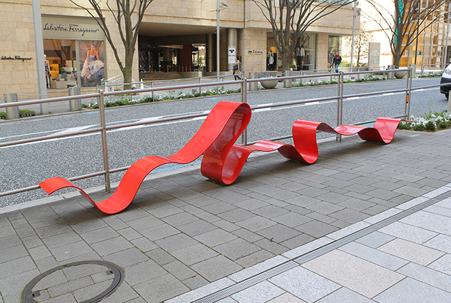 続いて森タワー周辺からけやき坂通り・さくら坂に場所を移すと、歩道上に出現するのが街路空間に華を添える「ストリートスケープ」です。無限大の形状をしたオブジェがアイビーをまとった『エバーグリーン?』(ロン・アラッド作)や、モノからある種の重力を取り除きたいと考案されたベンチ『愛だけを…』(内田繁作)などが六本木の街の景観にアクセントを加えています。