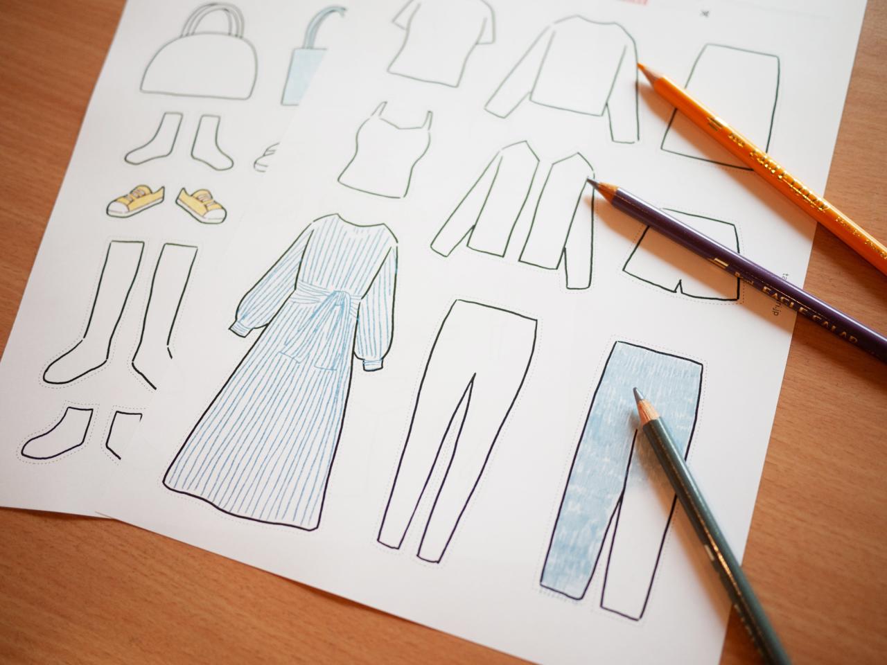 旅先でのコーディネートを想像してベースとなるパーツを選びます。自分の持っている洋服を思い描きながら、色鉛筆やペンなどで描きこんでいきます。