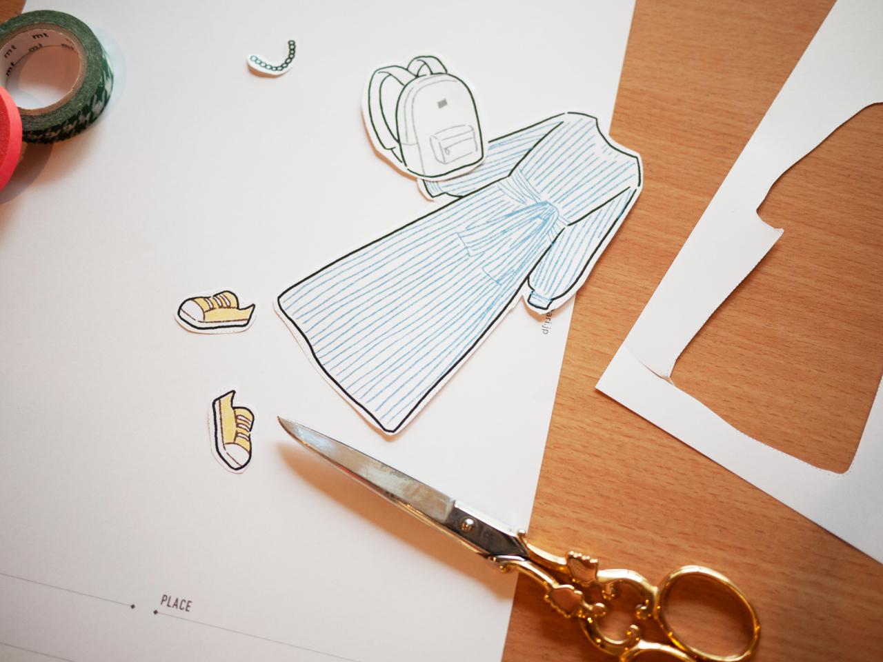 描きこんだパーツを、ハサミなどで切っていきます。台紙の上で、切り取ったパーツをコーディネートに合わせて組み合わせていきます。