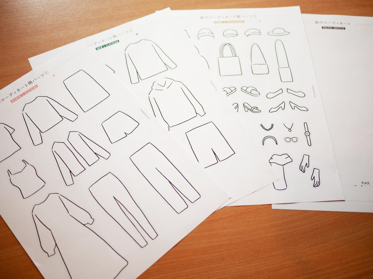 まずはコーディネートキットをダウンロードして、プリントアウトします。パーツ3種(女性服、男性服、グッズ&アクセサリー)と台紙、そして表紙の5枚のセットとなっています。