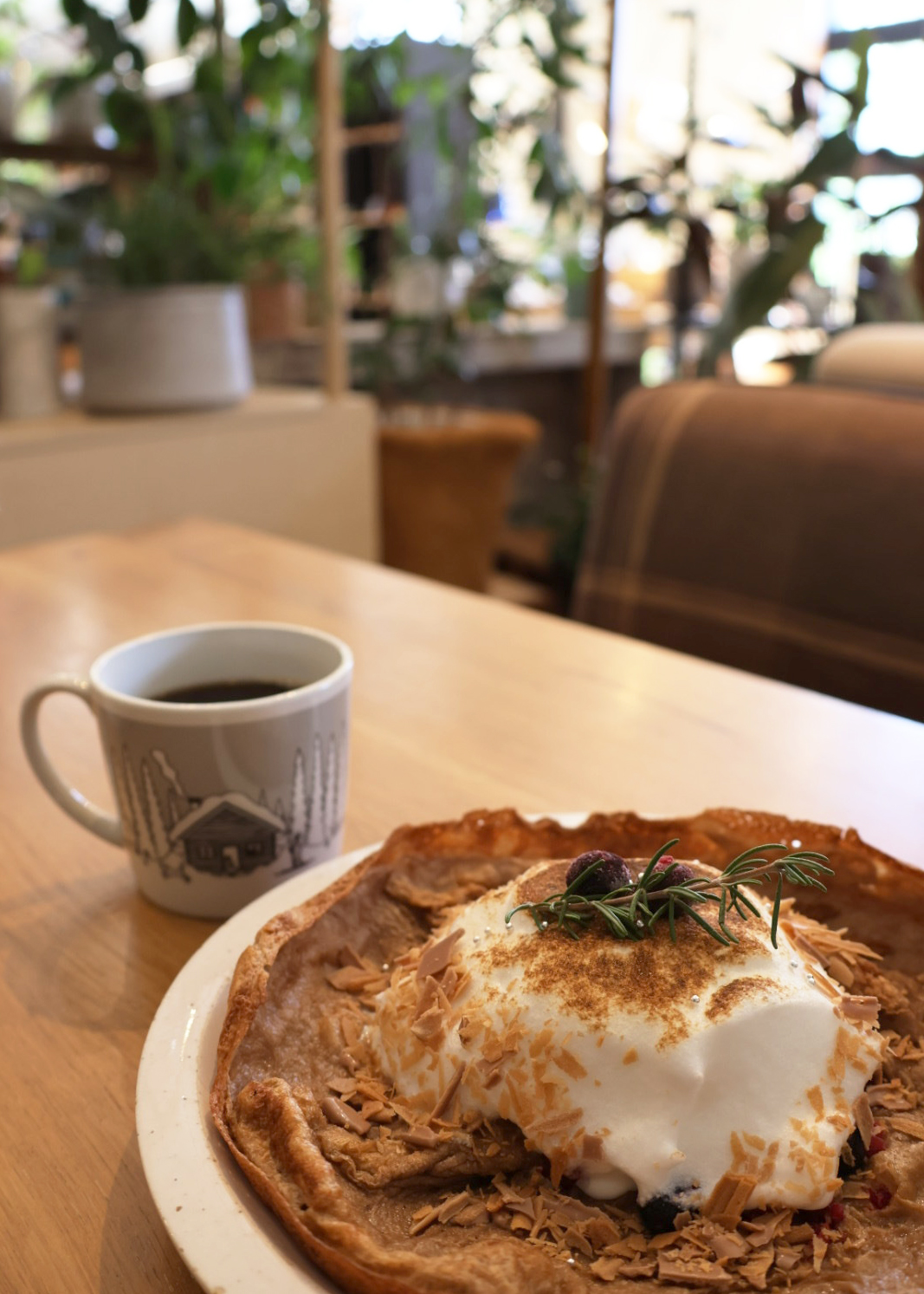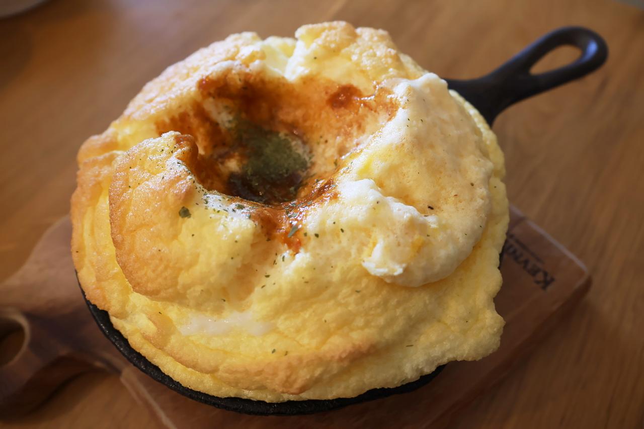 卵をふんだんに使った生地をスキレットで焼き上げた、ドイツ生まれのパンケーキ“ダッチベイビー”がお店の看板メニュー。今回いただいた、期間限定「スノーマウンテンダッチベイビー」は年内の営業まで提供されるクリスマスシーズンにぴったりの一品。