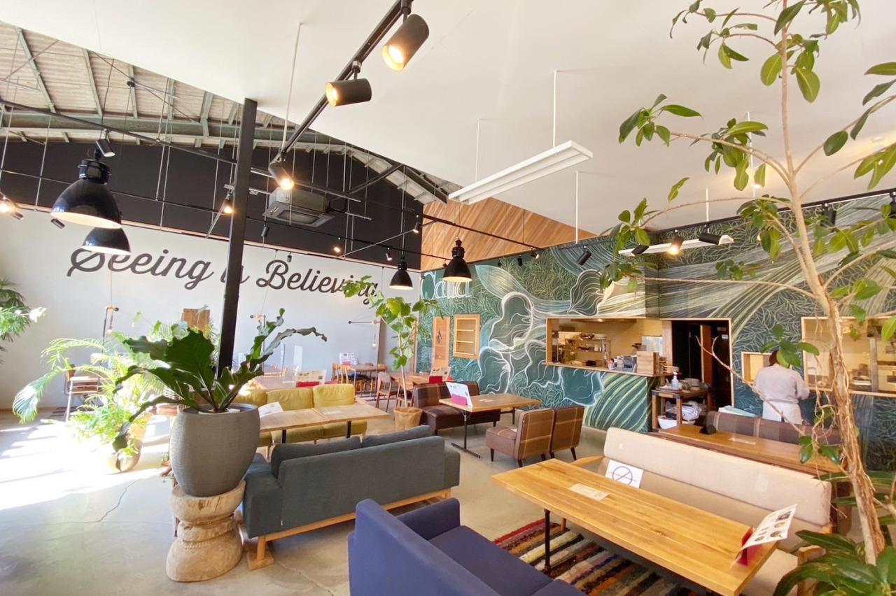 静岡県・沼津港近くの住宅街の中にあるカフェ〈Mission Bay〉は、外観は倉庫のようですが、中に入ると一変。天井が高く開放感のある広々とした店内には観葉植物が沢山置かれていて、天気がよい日は日差しがはいりこみ、ソファー席でお昼寝したくなる程の居心地のよさ。