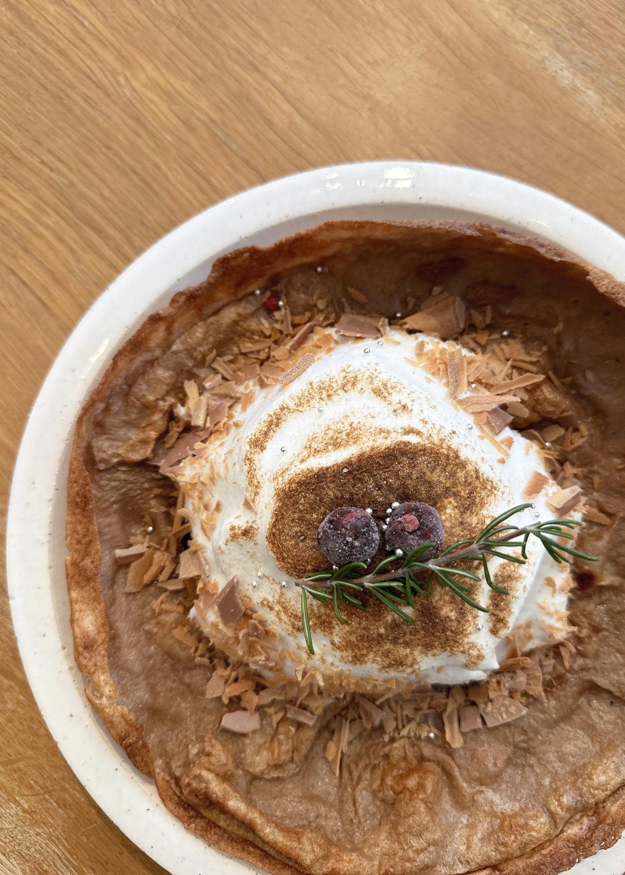 雪山をイメージしたメレンゲの中にバニラアイスが隠され、ベリーの酸味とココア味の生地が味わい深いほろ苦ダッチベイビー。生地はもっちりとした食感で、パンケーキというより、厚めのクレープに近い感じ。モチモチの食感と外側のパリパリの食感が絶妙です。