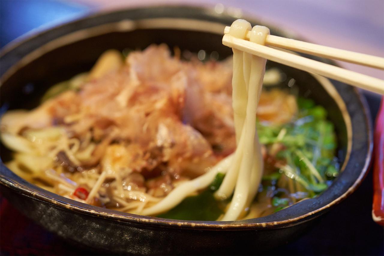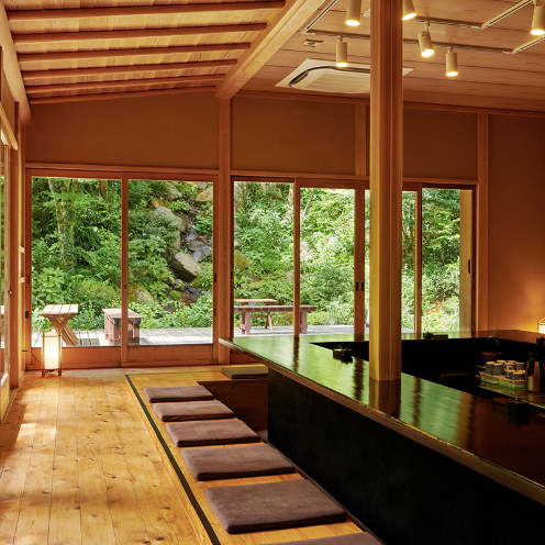 昭和初期に建てられたという日本家屋をリノベーションした〈開化亭〉は、伝統的な和のスタイルでありながら、モダンな雰囲気。板の間のコの字カウンター席、奥座敷には掘りごたつ式の座席があり、どちらも旅の疲れを癒してくれる温かみがある。外の景色を眺められる窓には、昔ながらの歪みが見えるガラスが残されている。独特の景色を作り出し、現在では出会うことは少ない貴重な窓だ。