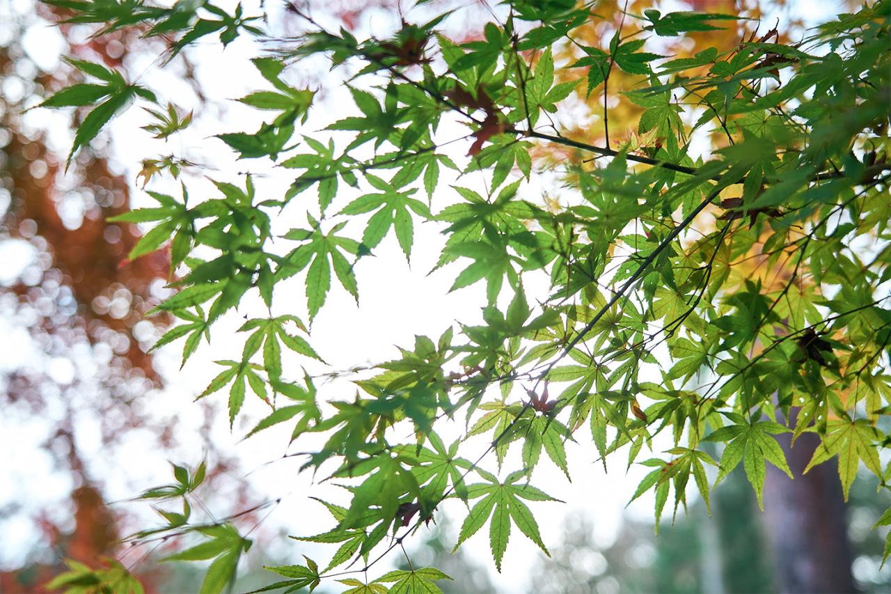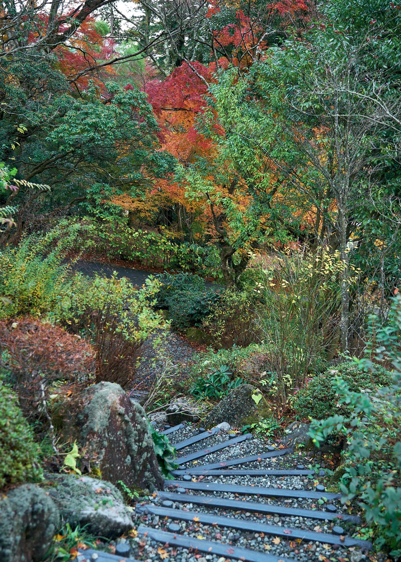 〈開化亭〉は美術館自慢の庭園の入り口にある。できる限り自然の姿を残して整備されているといい、季節ごとに花や木々の彩りが移ろっていく。11月下旬のこの日は、鮮やかな紅葉と常緑樹の色合いが美しいコントラストを作り出していた。勾配のある園内の階段を登れば、〈開化亭〉を一望でき、建物見物にもピッタリ。