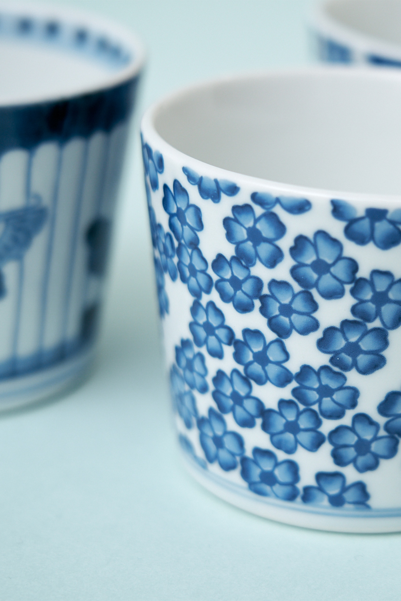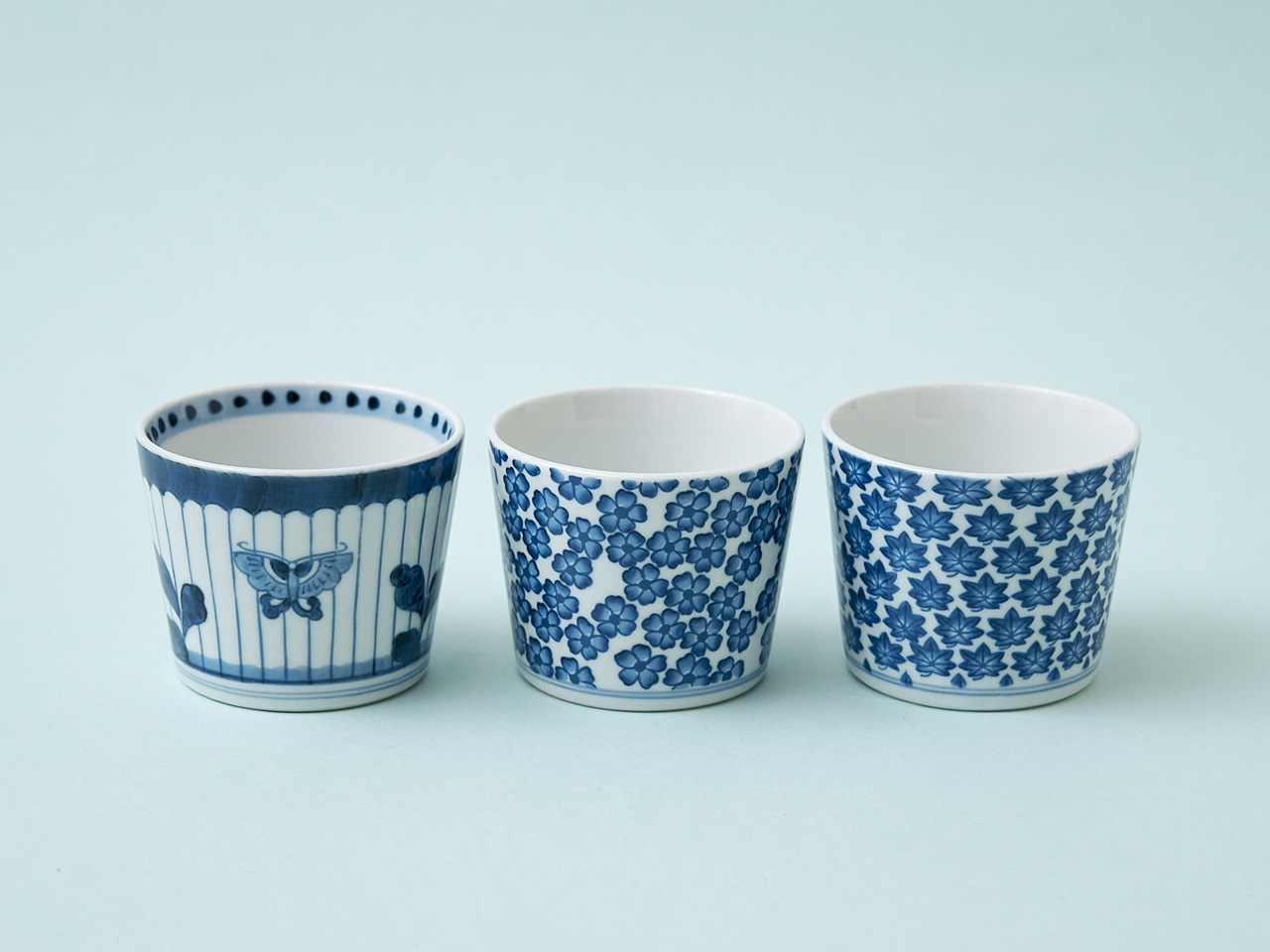 古九谷や鍋島などのやきものは富裕層向けの高級な品だが、蕎麦猪口や豆皿など日常的に使われたやきもの・古伊万里も収蔵される。上の写真は、それをモチーフに作った蕎麦猪口。右側の紅葉模様は「染付紅葉文皿」、中央の桜柄は「染付桜文大鉢」をもとにし、本物の絵柄を違う形で楽しむことができる。一方左端の蝶々柄は、題材となる器も「染付蝶文猪口」という蕎麦猪口。内側の文様まで真似られている。