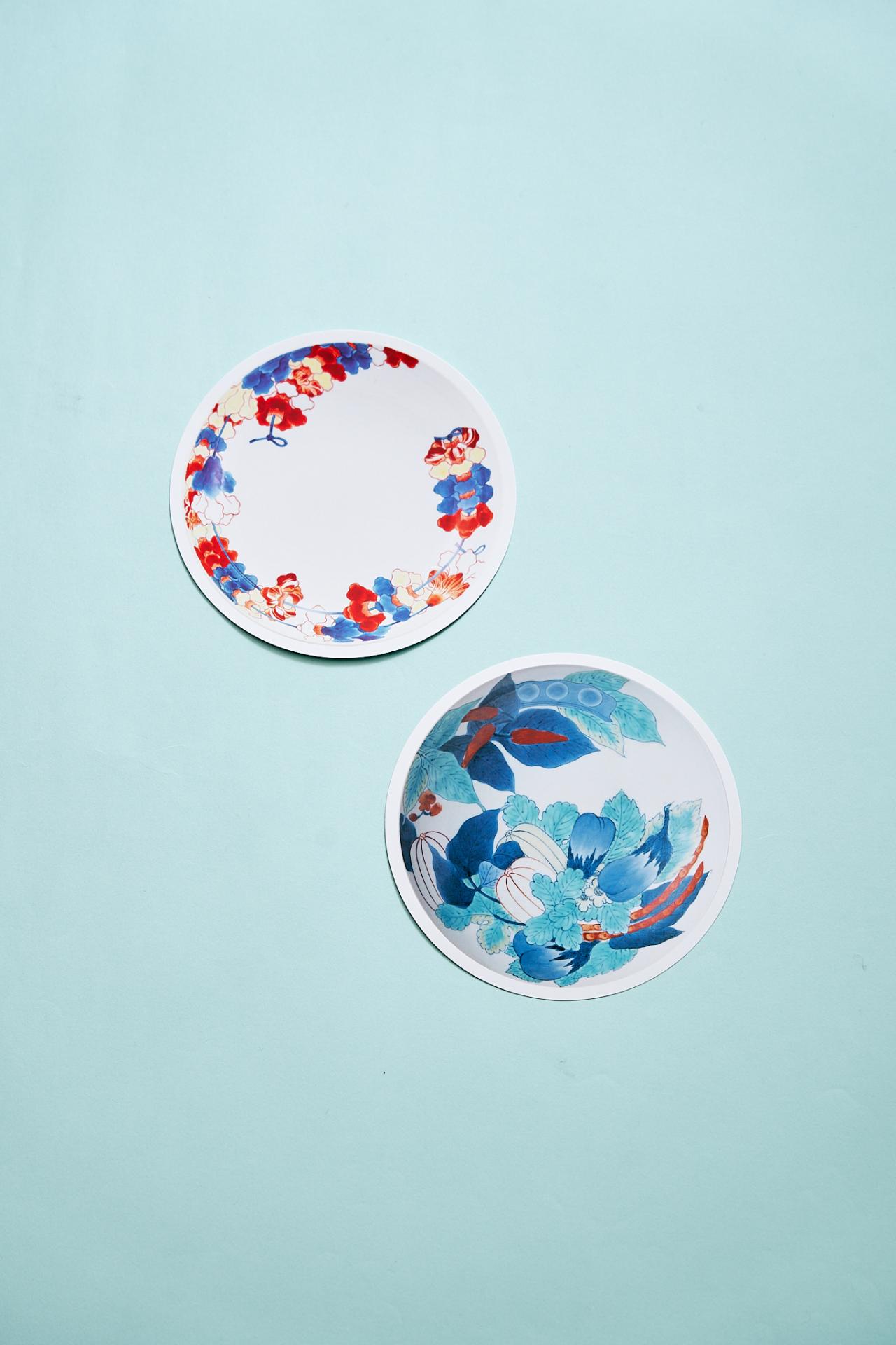 江戸時代、将軍家や大名への贈答品に重宝されたという鍋島焼。染付で文様を描いた上に赤・緑・黄で絵付をした「色鍋島」は特に絵画のように美しい。今も古びないデザインは、グラフィックとして楽しむこともできる。このミュージアムショップでは、丸型のハガキやシールなど、陶磁器の形に切り抜いたような紙のアイテムが作られている。