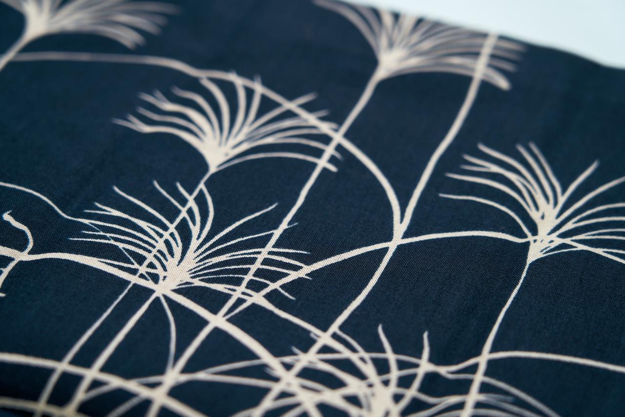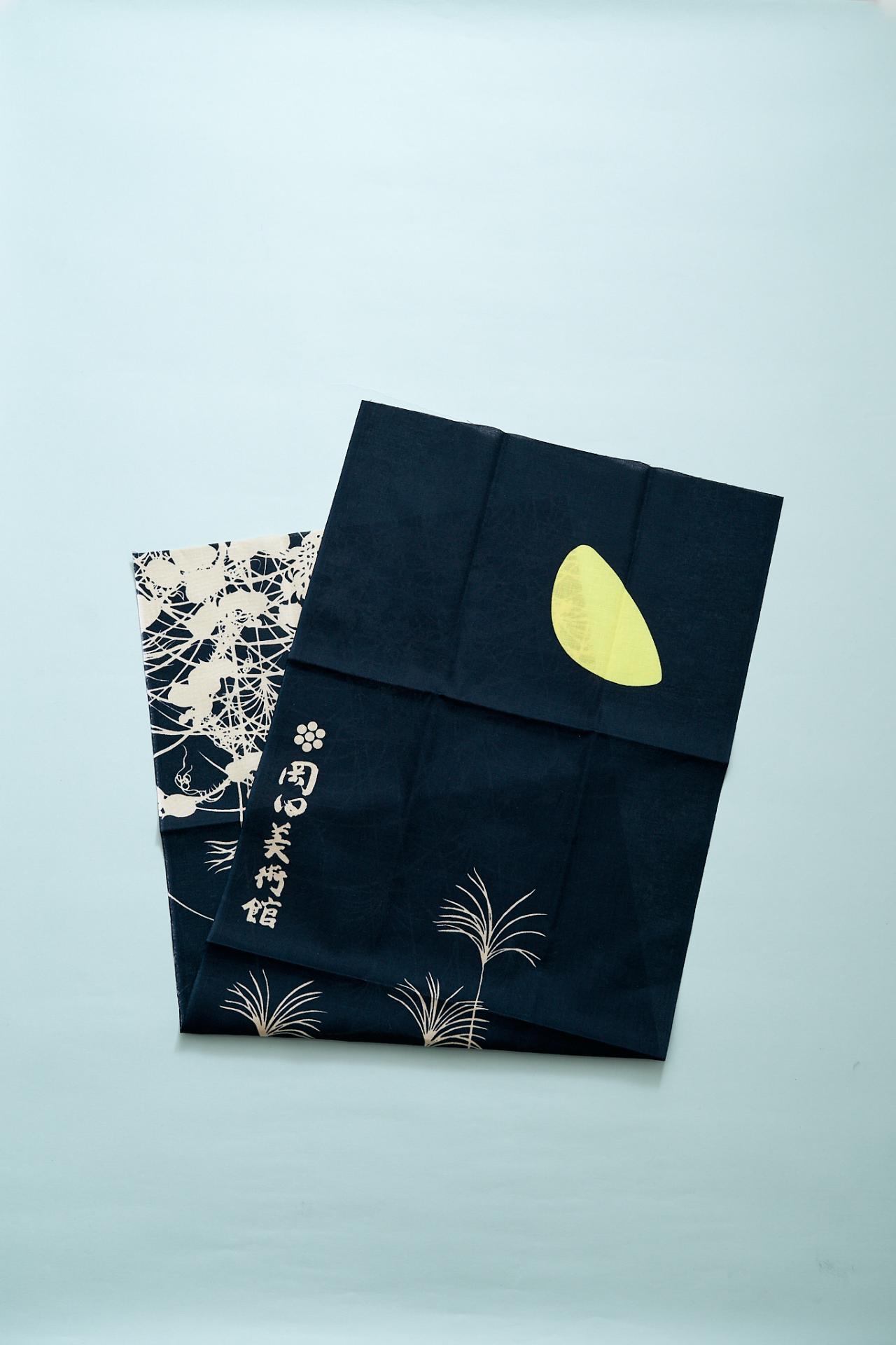 酒井抱一「月に秋草図」を配した手拭い。実際は白地に金銀と発色の良い岩絵具でカラフルに描かれた襖絵だが、濃紺の布地、月を輝くイエローに。作品との違いを見ることも、土産話の一つになる。
