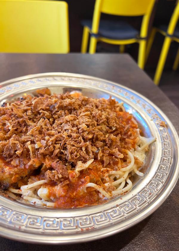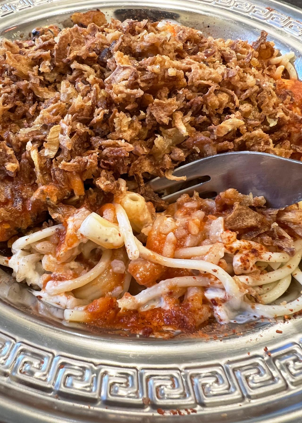 続いていただくのは「コシャリ」。こちらは屋台などで気軽に食べられているというエジプトの国民食で、日本で言えば牛丼とか、カレーの存在が近いそう。具材はお米、マカロニ、パスタ、豆、そしてたっぷりのフライドオニオンが基本で、今回はチキンをトッピング。全部混ぜ、ソースをよく絡めて食べるのがコツだそうです。