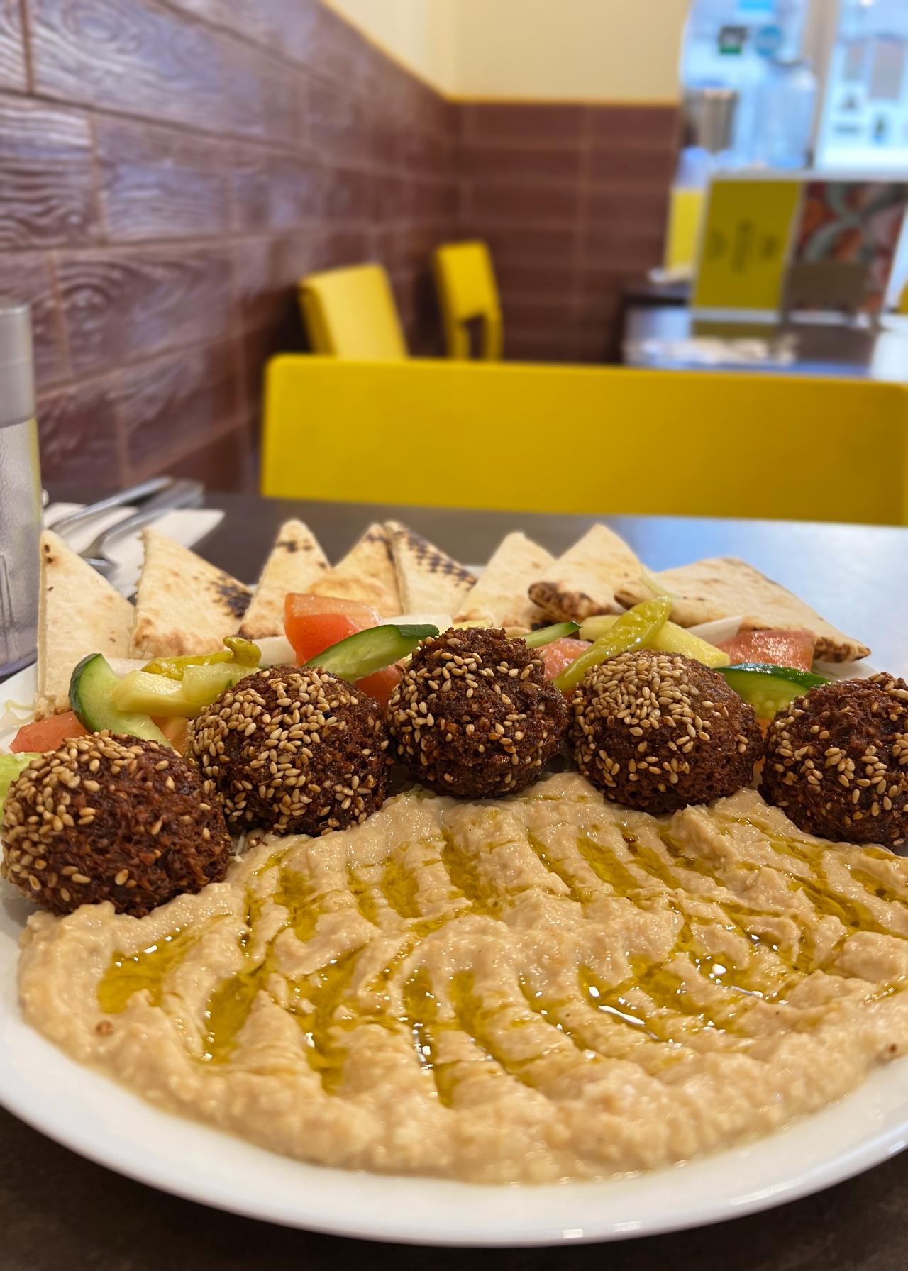 ファラフェルの手前にあるペーストは「フムス」といってこちらもひよこ豆を潰してペースト状にしたもの。添えられたピタパンに付けたり、ファラフェルや野菜と一緒に挟んでいただきます。どちらも同じひよこ豆でできていると思えないほど、味や食感に違いがあって、食べ飽きません。