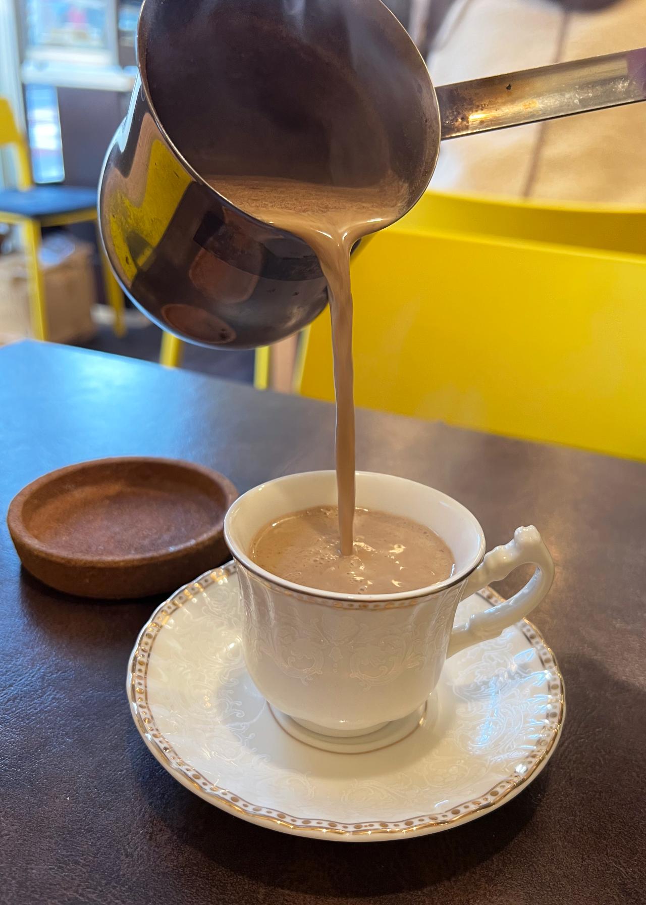 食後のコーヒーは是非珍しいものを!とお願いして、「ノバコーヒー」をいただきました。コーヒー豆とスパイスを直接煮出すという“アラビックコーヒー”を、牛乳で淹れたもので、チャイのコーヒー版といったイメージです。スパイシーさに、牛乳のコクが加わってとっても濃厚!日本でこの「ノバコーヒー」を出す店はかなり珍しいとのこと。一瞬でこのアラブの不思議なコーヒーの虜になりました。