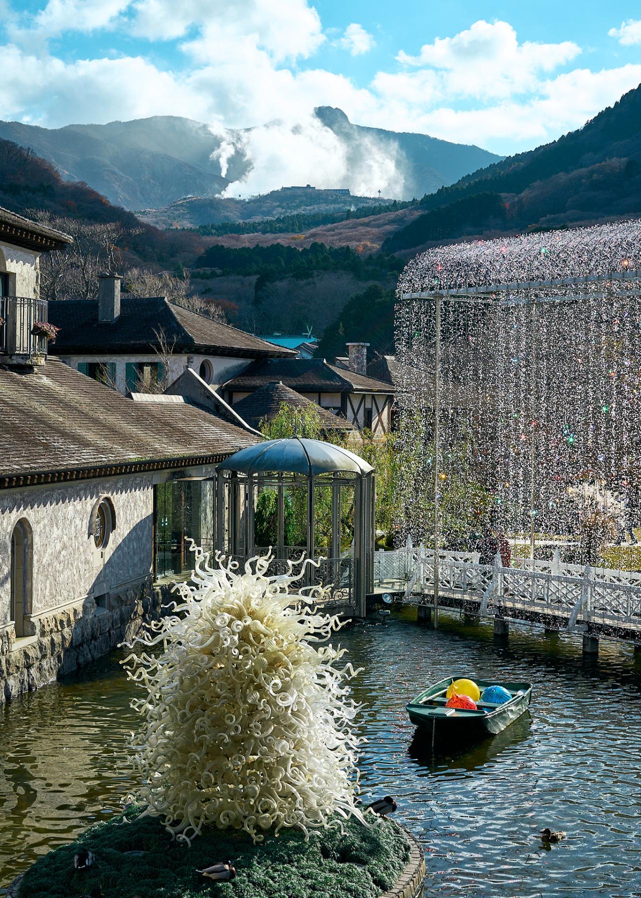温泉、食べ歩き、リトリートなど、箱根を旅する目的は数あるけれど、美術館めぐりも人気の一つ。扱う分野にそれぞれ個性があり、一度では回りきれないほどの軒数だ。今回向かったのは、「箱根ガラスの森美術館」。ヴェネチアン・グラスを中心に展示するミュージアムだ。標高640mにある観光地・大涌谷を綺麗に望めるのは、ここだけだという。それだけでも訪れるきっかけになる。