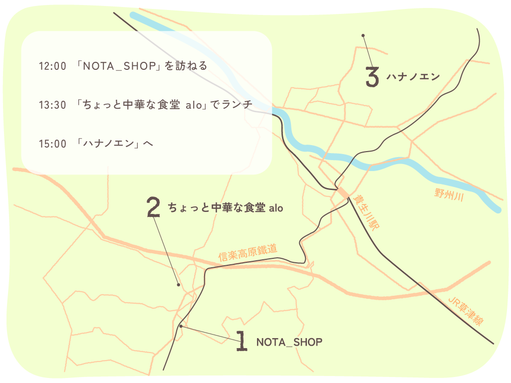 いつもと違う滋賀県観光には、〈NOTA_SHOP〉〈ちょっと中華な食堂 alo〉〈ハナノエン〉がおすすめ。