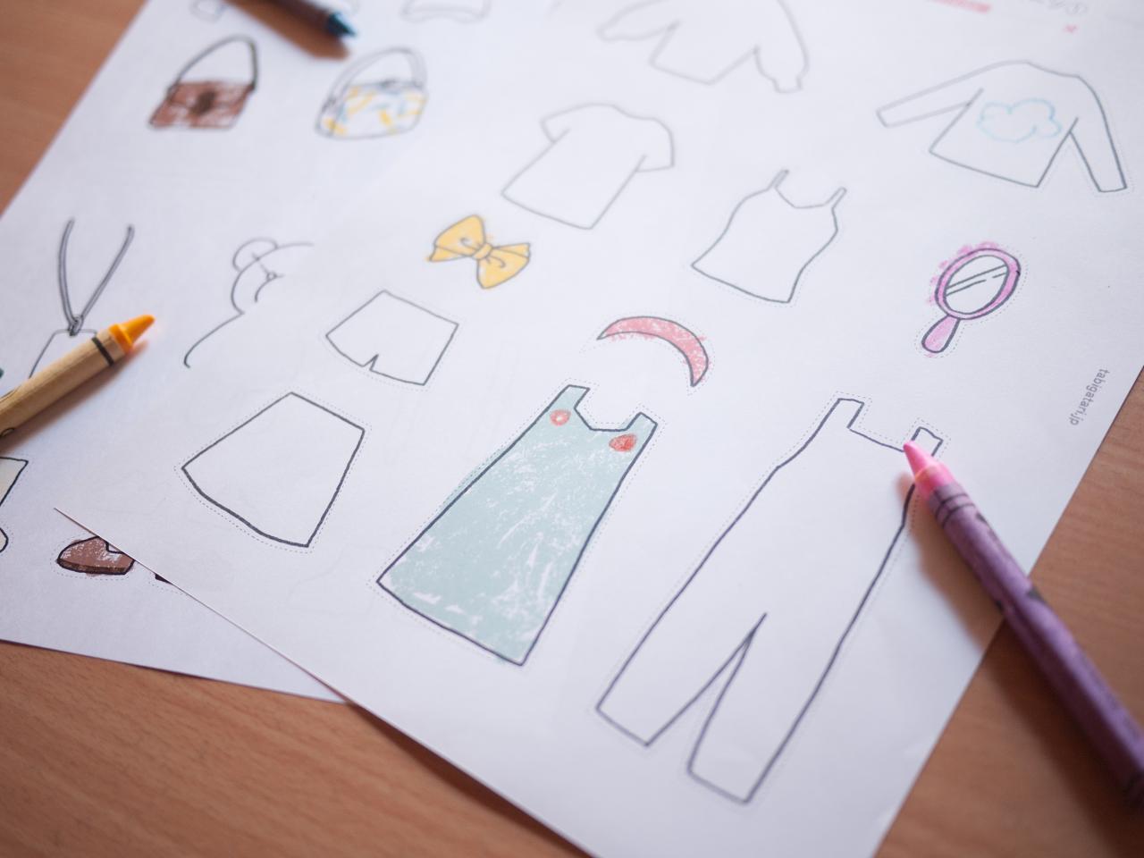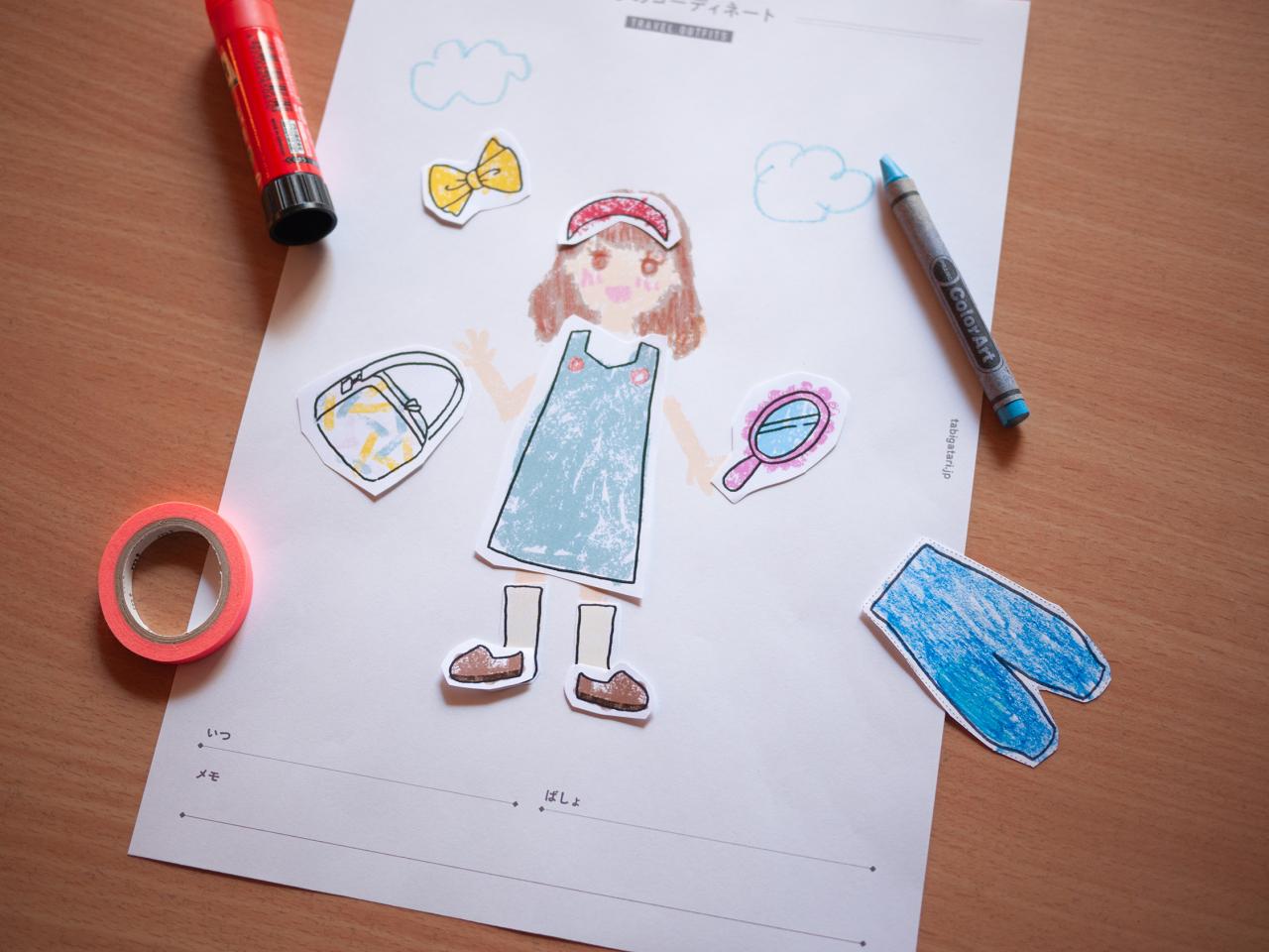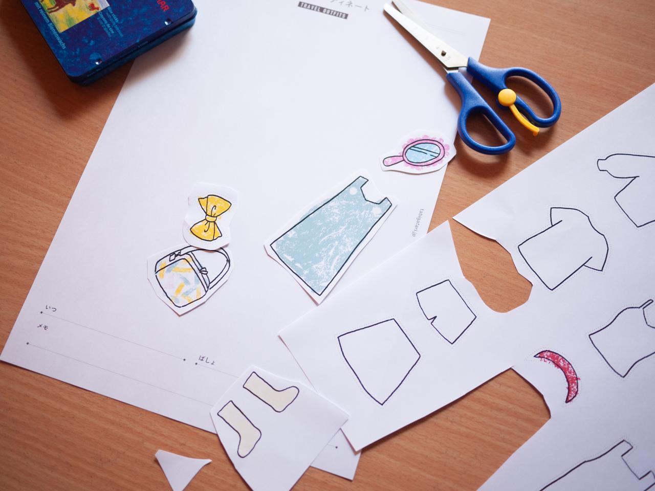 描きこんだパーツを、ハサミなどで切っていきます。服装だけでなく、持っていきたいおもちゃなども一緒に描いても楽しいですよ。