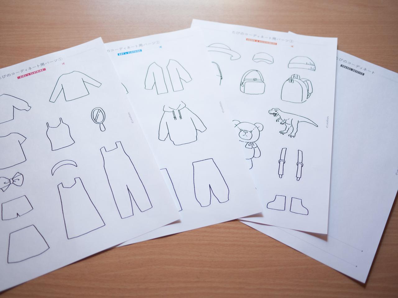 まずはコーディネートキット(キッズ版)をダウンロードして、プリントアウトします。パーツ3種(女の子、男の子、グッズ&アクセサリーとおもちゃも少し…)と台紙、そして表紙の5枚のセットとなっています。