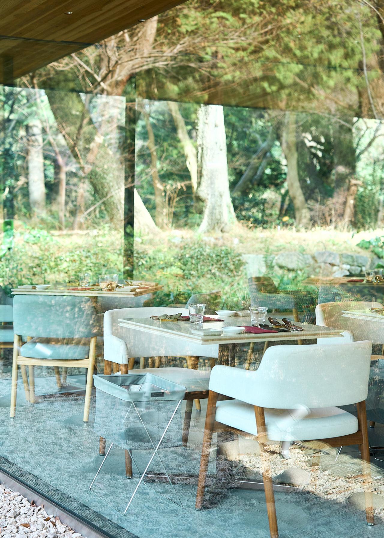 正門横にある1階建てがレストラン。2022年10月にリニューアルし、イタリアンをベースにした料理がいただけるようになった。入店するとまず、開放的な景色に驚かされる。フルハイトの窓が2面の壁を作り、四季折々の彩りを見ることができる。季節になれば、辺りは桜色に染まるのだとか。常緑樹も綺麗に植えられ、冬でもこの美しさ。この空間でのランチなら、週末には予約で満席になってしまうのも頷ける。