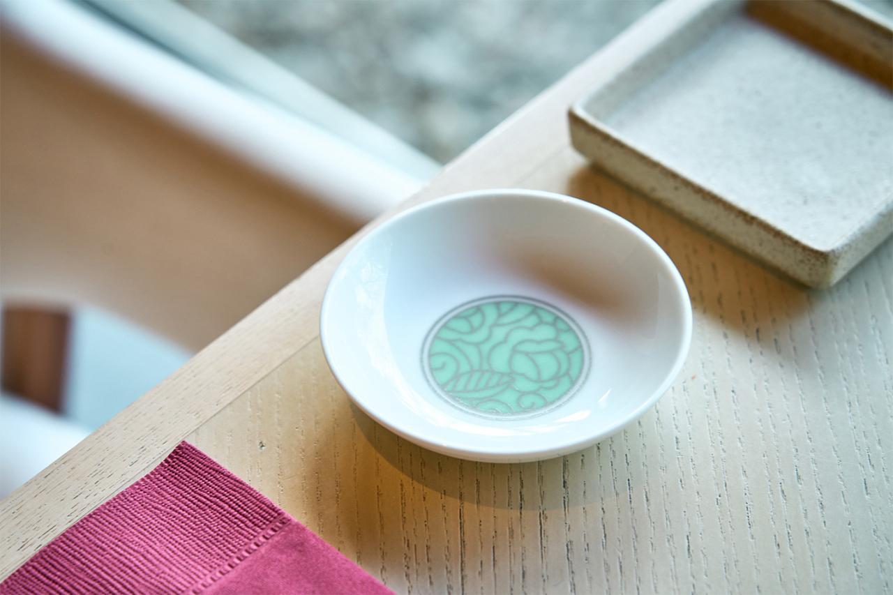 白でまとめられた器の中で、少し気になるのがオリーブオイル用の小皿。これは美術館オリジナルのアイテムで、本館の階段に用いられる飾りがモチーフだそう。食後は、どこにあるか探しに行ってみよう。