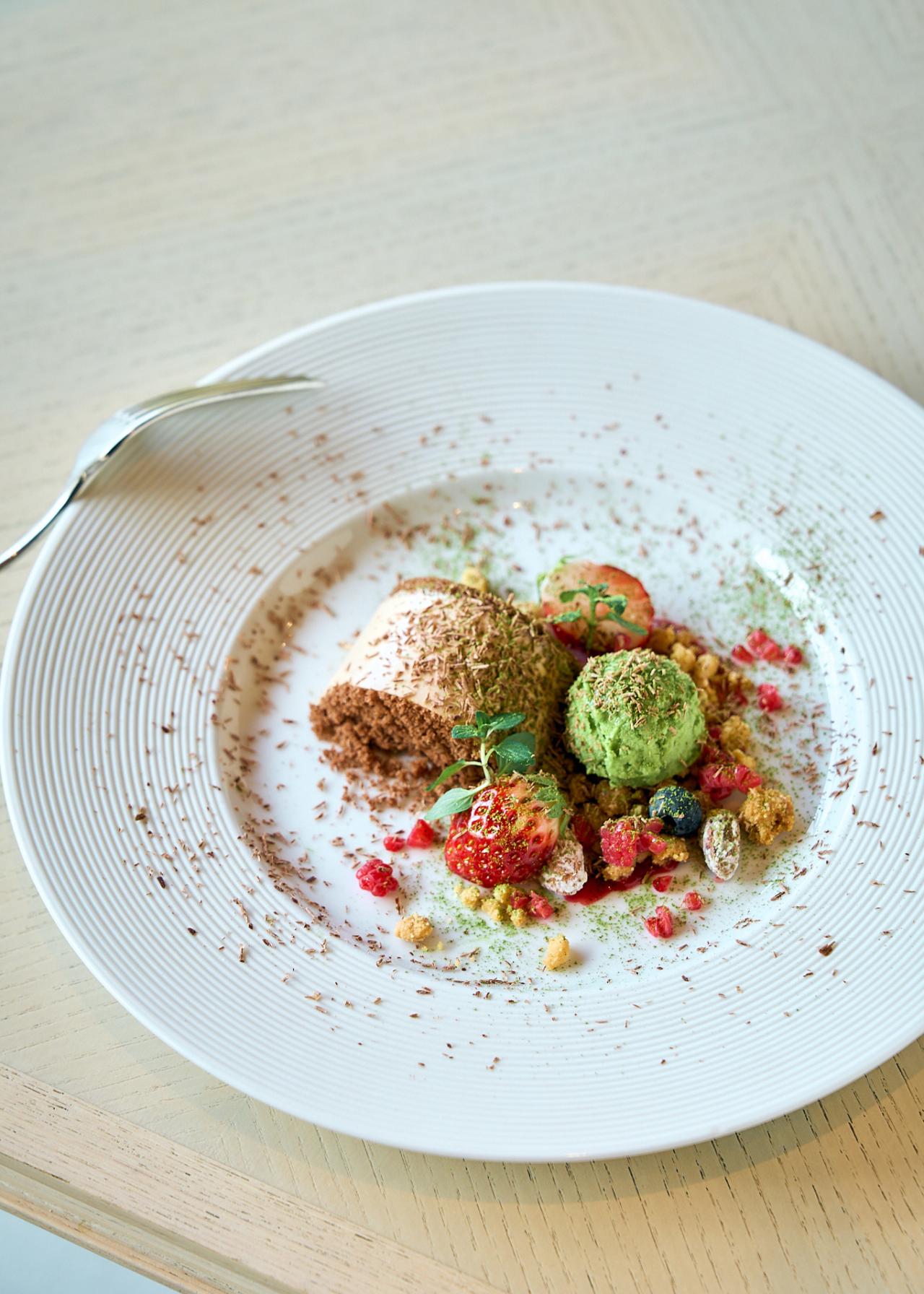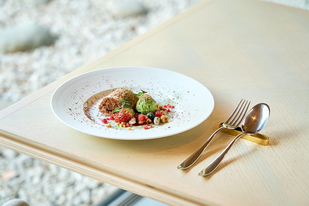 女性客に人気だというこのレストラン。デザートまで抜かりなく、キュンとする一皿が運ばれてきた。季節によって変わる内容は、やはりガーデンのような装い。写真は、プラリネとチョコレートのムース、抹茶アイス、フレッシュなフランボワーズなど、待ち遠しい春を思わせるようなプレートだった。