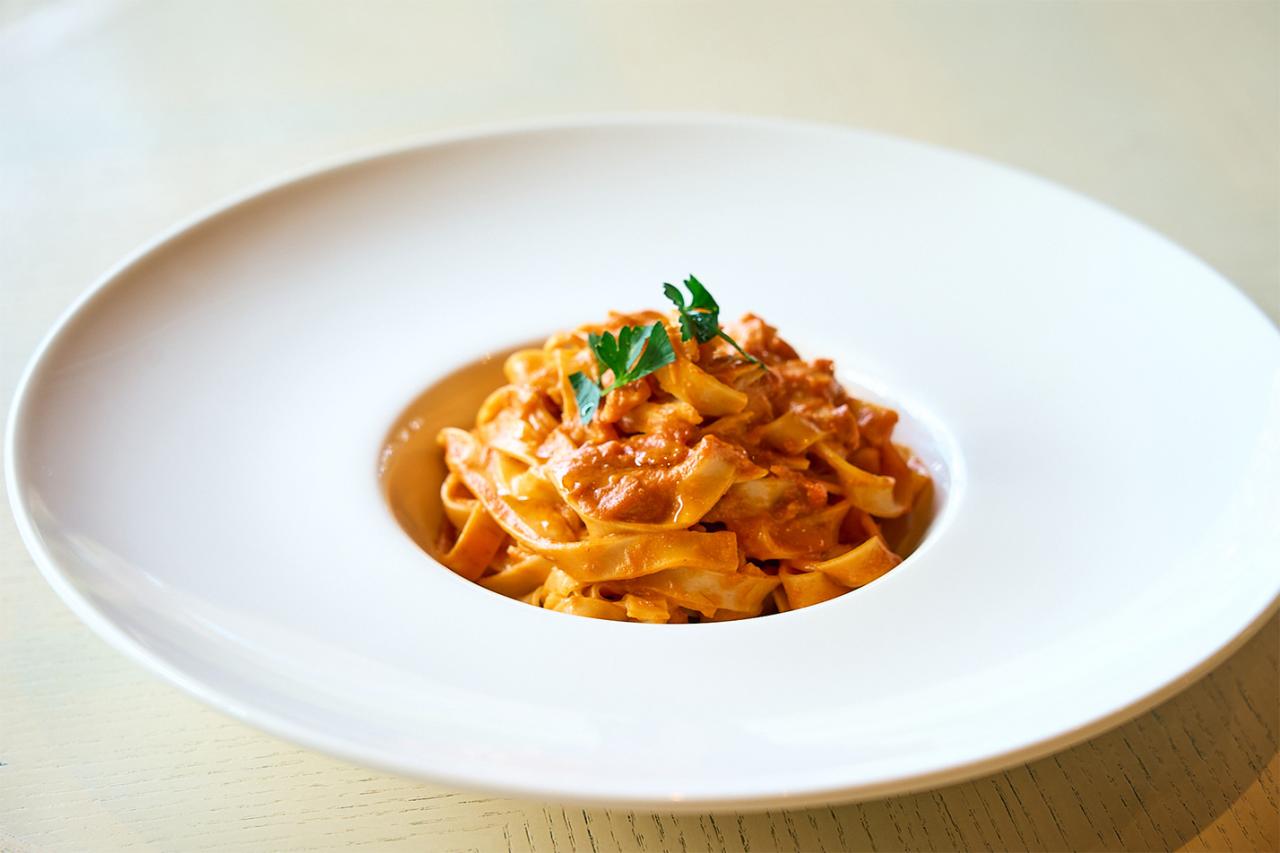 選べるパスタのうち、この日のラインナップにあったズワイガニとトマトのタリアテッレをセレクト。ほぐしたカニの身がたっぷりと入っていて、トマトの旨味と相乗効果がある。ほかの日にはフジッリやカサレッチなどのショートパスタ、リゾットのチョイスもあり、行くたびに違った味に出会えそう。夜のコースでは、自家製生パスタも登場するという。景色を楽しむランチ、料理とじっくり向き合うディナーと、気分を変えて訪れるのもいいかもしれない。