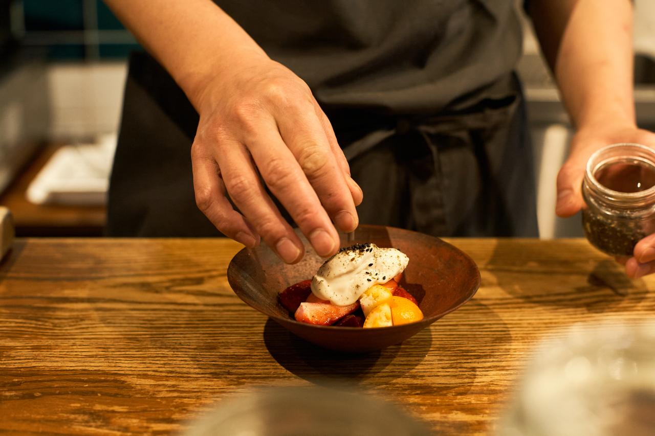「もともと創作料理が好きだったのですが、京都のカフェで8年半料理長を務めた際、ジャンルを問わない料理をいくつもつくった経験が今につながっているような気がします。あと、〈To.〉は台所をイメージして作られているので、じつは2口タイプのコンロや電子レンジといった限られた設備しかないんです。制約があるなかでいろいろ試行錯誤したことも、創作の幅を広げてくれたのだと思います」と吉田さん。