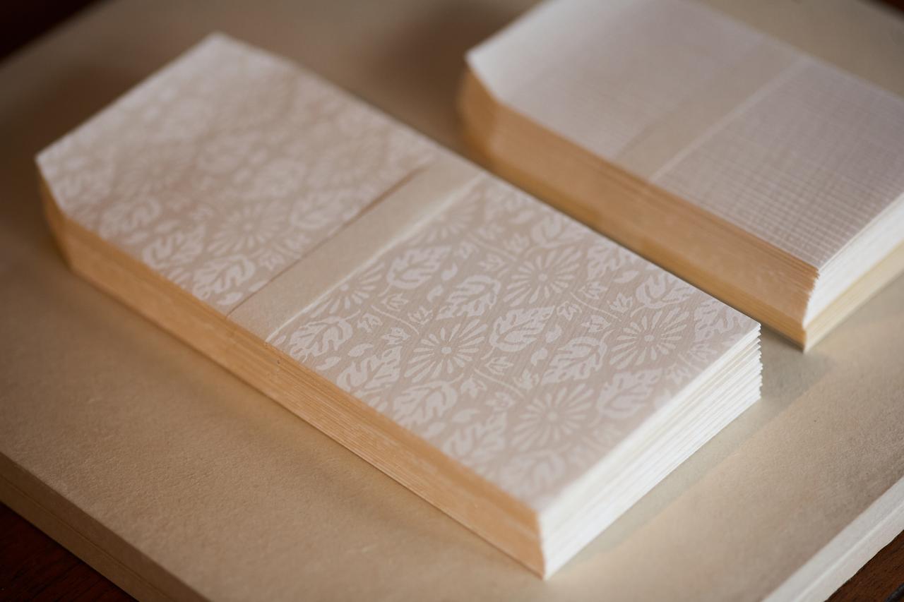 「木版刷りは印刷の基礎ですから、非常に興味を持ちました。作業自体はすごく単純なのですが、長年つくり続けても飽きない不思議な魅力があります。和紙や顔料、接着剤の役割の布海苔(ふのり)など、自然のものだけを使っているところも健康的で好きな部分です」と嘉戸さん。2009年にショップ兼工房をオープン。当初より続けているのが封筒やメッセージカードなどの販売だ。