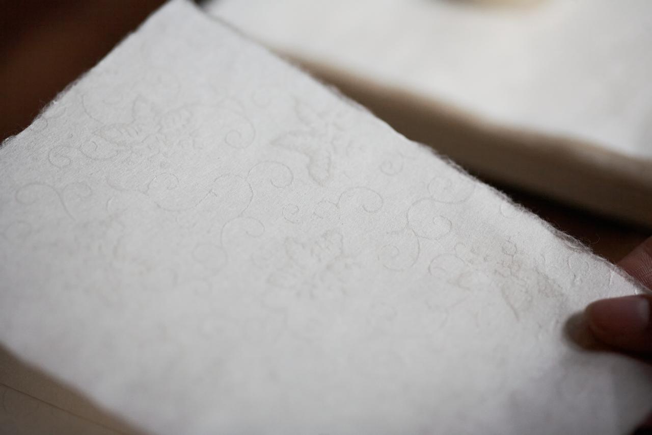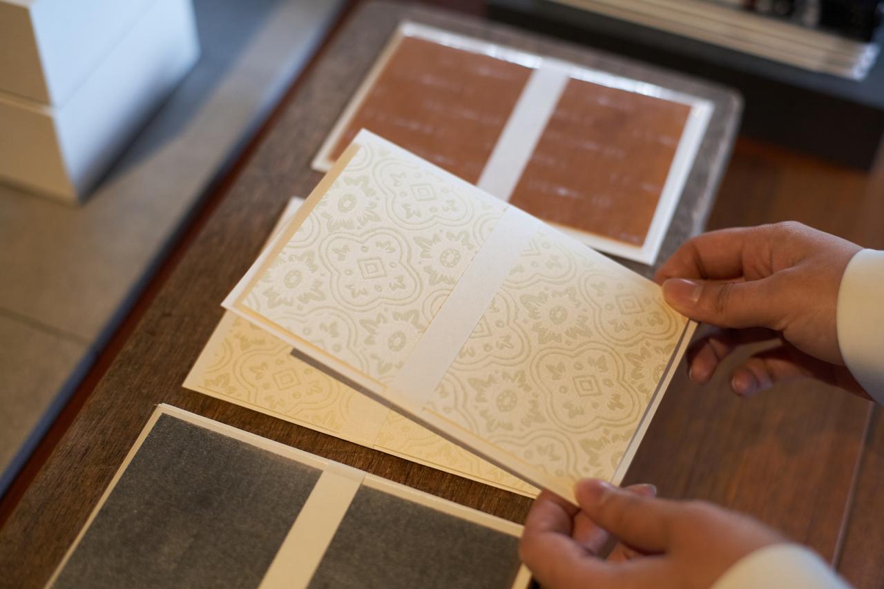 「基本的に、唐紙は和紙に胡粉を塗り、版木を使って雲母で文様を型押ししてつくられます。作業はすべて手作業です。普段は和紙職人や版木を作る職人、襖や障子を貼る職人とチームになって仕事をしていて、私は主にデザインの考案、染めと手刷りの作業を担当しています」