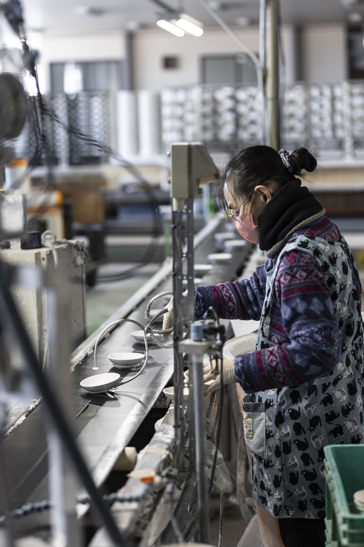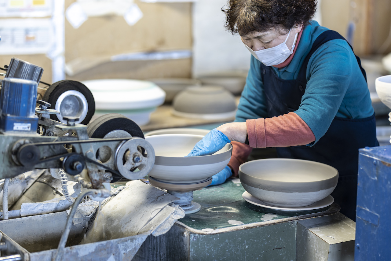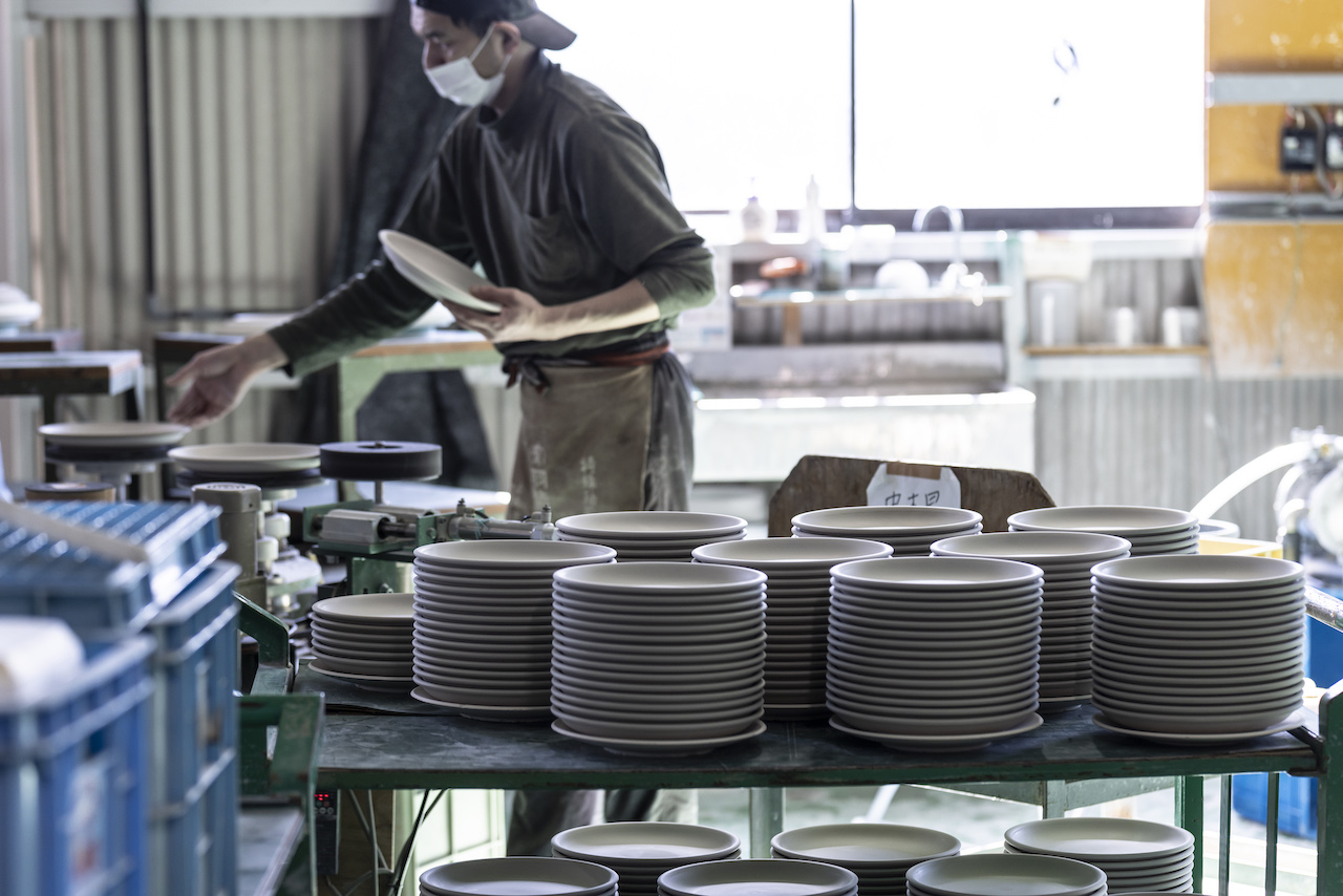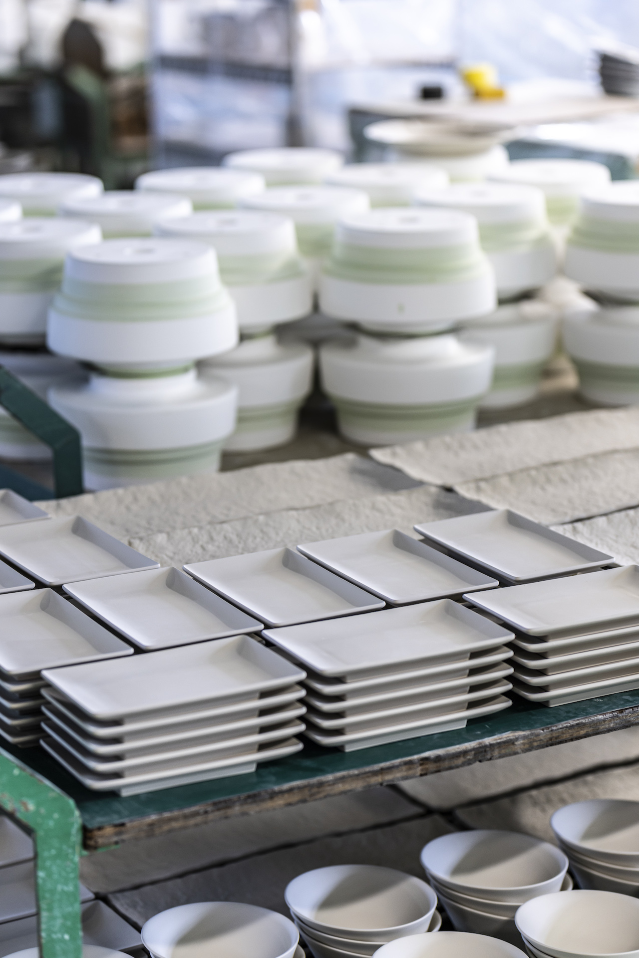 スタッフの吉永ひな野さんの案内で、まずはうつわの製造現場を見学させていただいた。〈KOYO BASE〉を運営する光洋陶器株式会社はホテルやレストラン向けのうつわのメーカーとして、東京オリンピックが開催された1964年に創業。以来、高品質な製品を国内外の食のプロフェッショナルに届けてきた。コロナ禍の影響もあり、近年では家庭用のテーブルウェアにも力を入れていて、生産するうつわの9割以上がオリジナル製品だ。