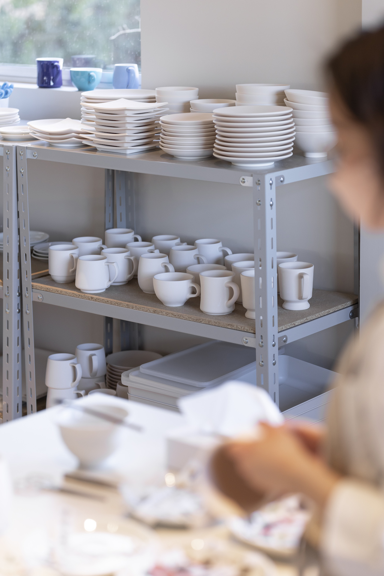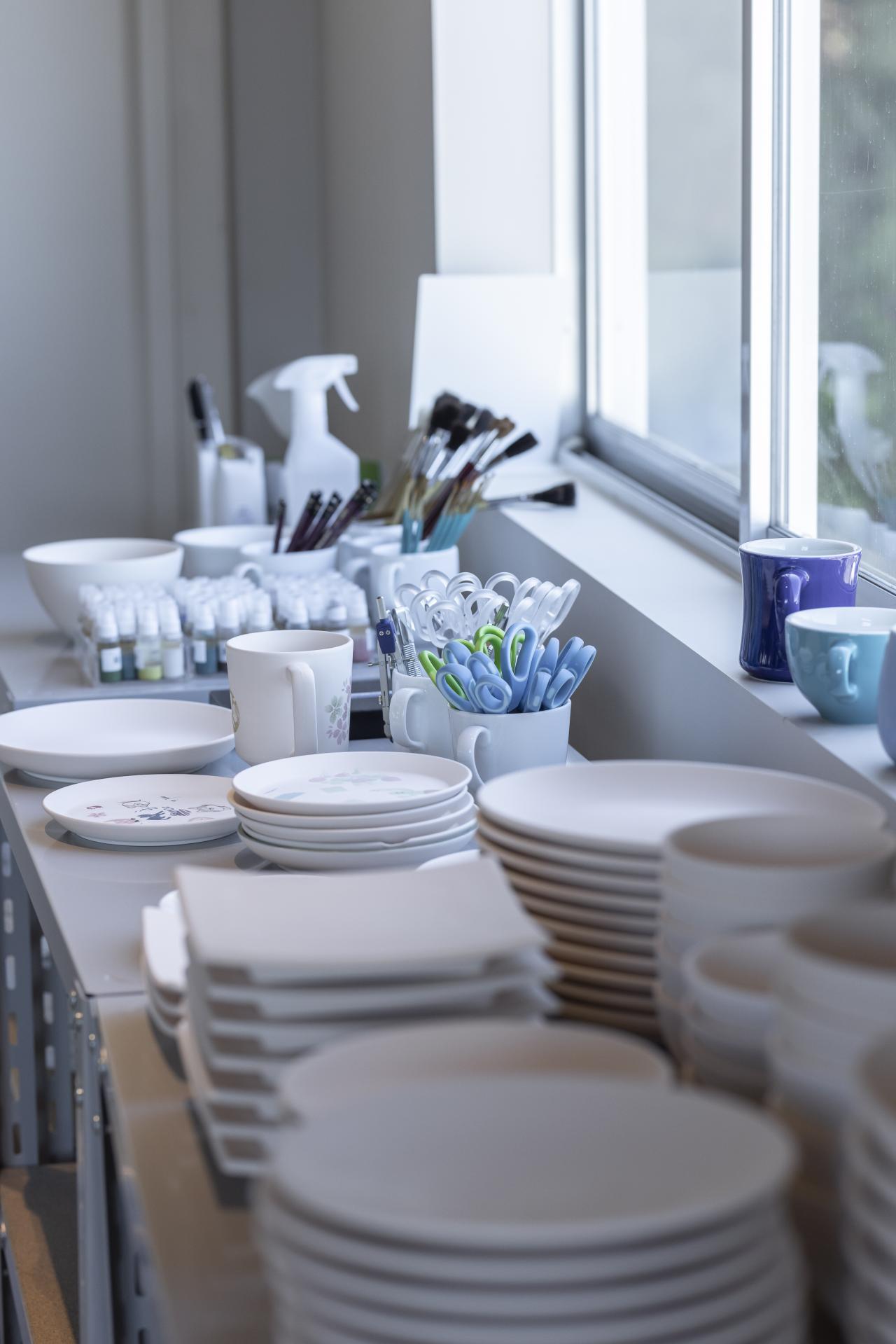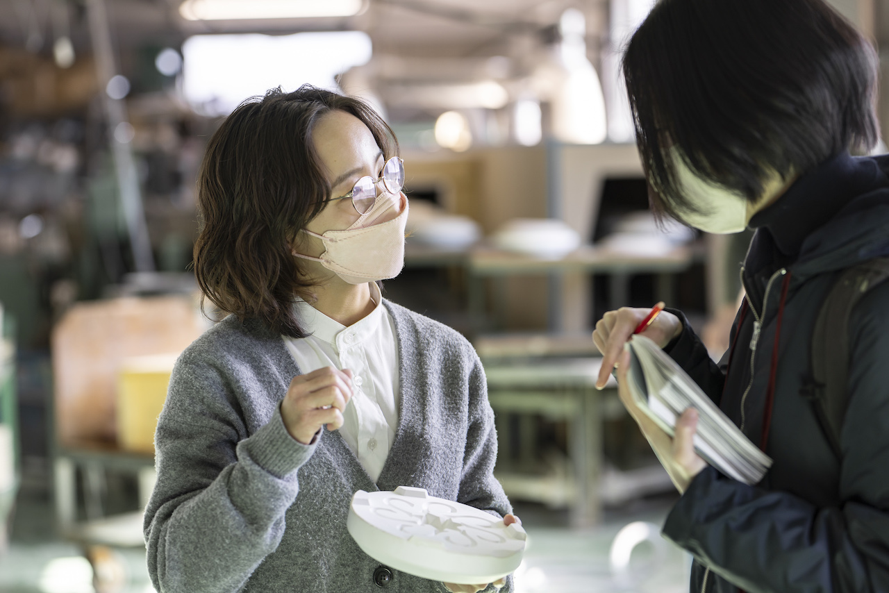 スタッフの吉永ひな野さんの案内で、まずはうつわの製造現場を見学させていただいた。〈KOYO BASE〉を運営する光洋陶器株式会社はホテルやレストラン向けのうつわのメーカーとして、東京オリンピックが開催された1964年に創業。以来、高品質な製品を国内外の食のプロフェッショナルに届けてきた。コロナ禍の影響もあり、近年では家庭用のテーブルウェアにも力を入れていて、生産するうつわの9割以上がオリジナル製品だ。