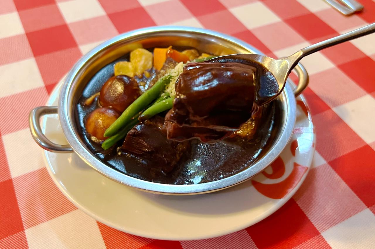「すぐできるけど大丈夫?」そう聞かれて本当にすぐ出てきたのは、お店の看板メニューともいえるビーフシチュー。入っている具材のすべてがゴロッと大きく、食べ応えがありそうなビジュアルが食欲をそそります。お肉は、スプーンで割くことができるくらいの柔らかさ。デミグラスソースは野菜のうまみが凝縮された大人な味わいで、牛すじと野菜を長時間煮込むことでコクに繋がるそうです。