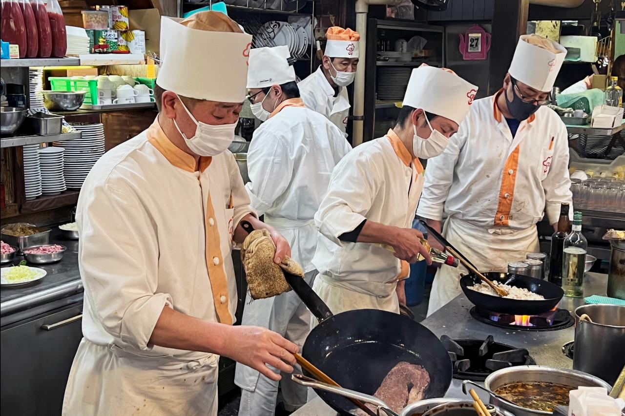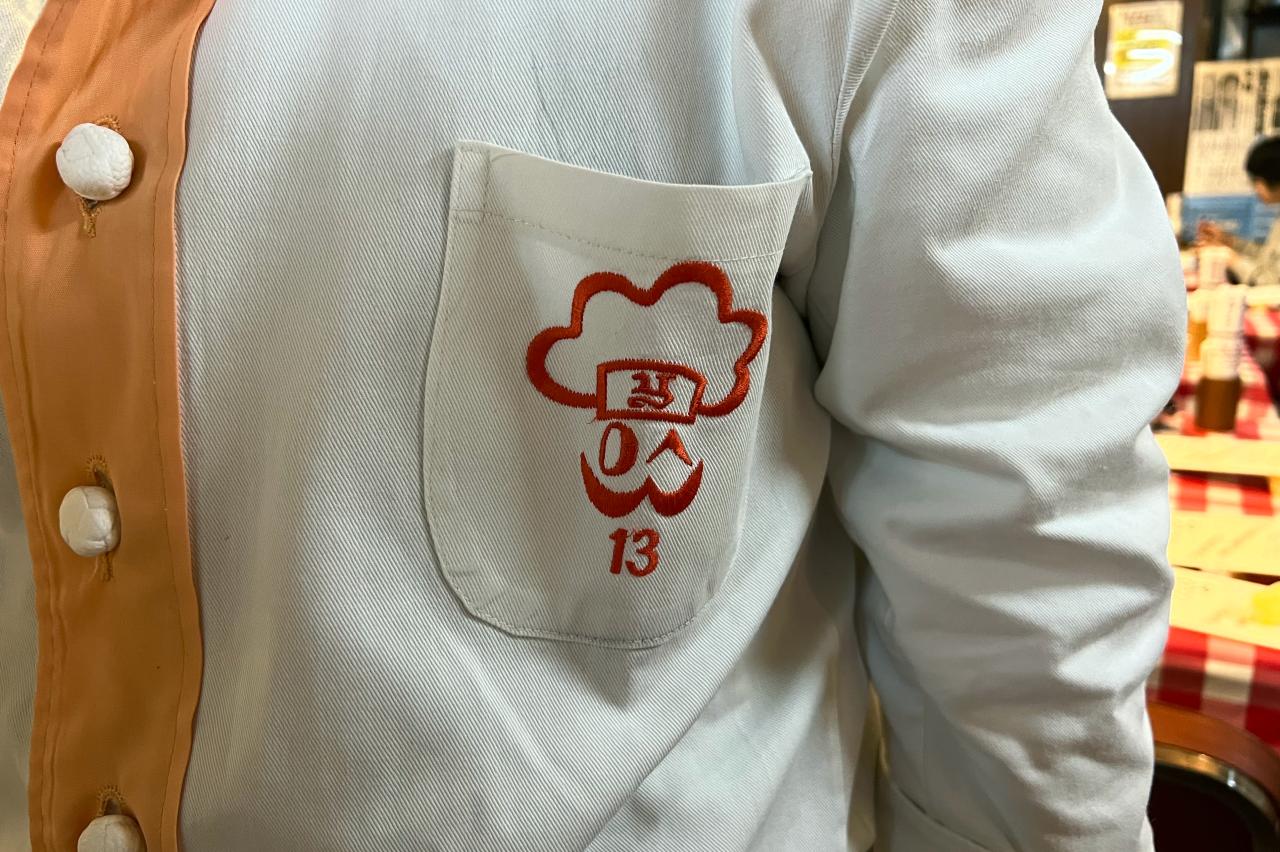店内で目を引くのが口ひげをはやしたコックさんのマーク。外装から店内、コックコートといたる所で見つけました。こちらはお店のキャッチコピー『旨すぎて申し訳ないス!』と共に昭和35年(1960年)頃より使われるようになったそう。このフレーズは「下町の洒落」「ここまで口にだしたからにはそれなりの料理を」という2つの思いが込められているとの事です。