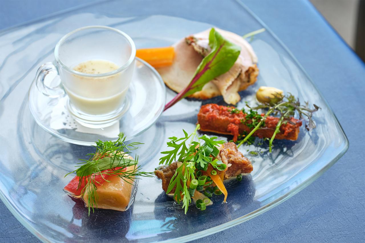 コースの一品目は、前菜盛り合わせ。この日は、ごぼうのアラビアータ、鯖のエスカベッシュ、ポロネギのマリネ、自家製ポルケッタに加え、「まぐろいも」と呼ばれる三浦のサツマイモを使ったポタージュが提供された。「『まぐろいも』は、マグロ加工で出る残渣(ざんさ)を肥料にして育てたサツマイモです。シンプルに味わってほしいから、ローストやポタージュにすることが多いですね」と須貝さんが教えてくれた。