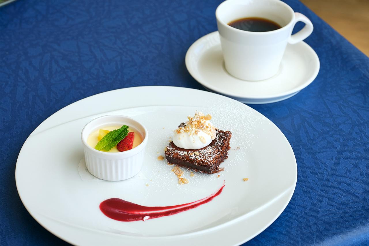 食後はデザート2種付きで、この日は、安田養鶏場の卵を使ったプリン、グルテンフリーのチョコレートケーキ「ヘップバーン」。手作りのデザートにも力を入れているという。