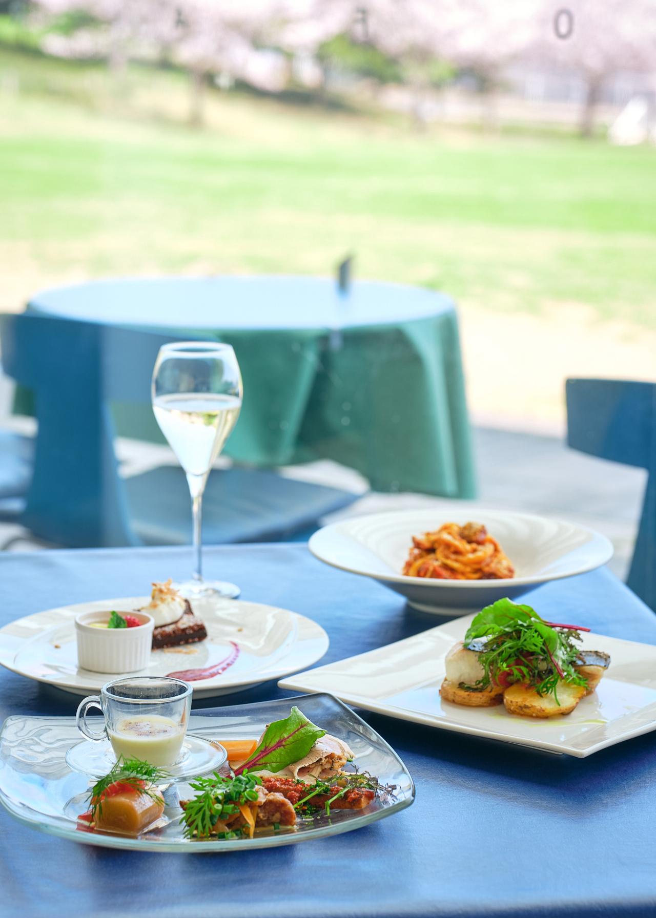 目の前の海には、1日約400隻もの船が行き交うらしい。原っぱの先を通り抜ける車、広い空を翔る飛行機も、レストランの中から見ているとのどかな風景。ほかにはない景色を堪能しながら、贅沢なランチをいただこう。