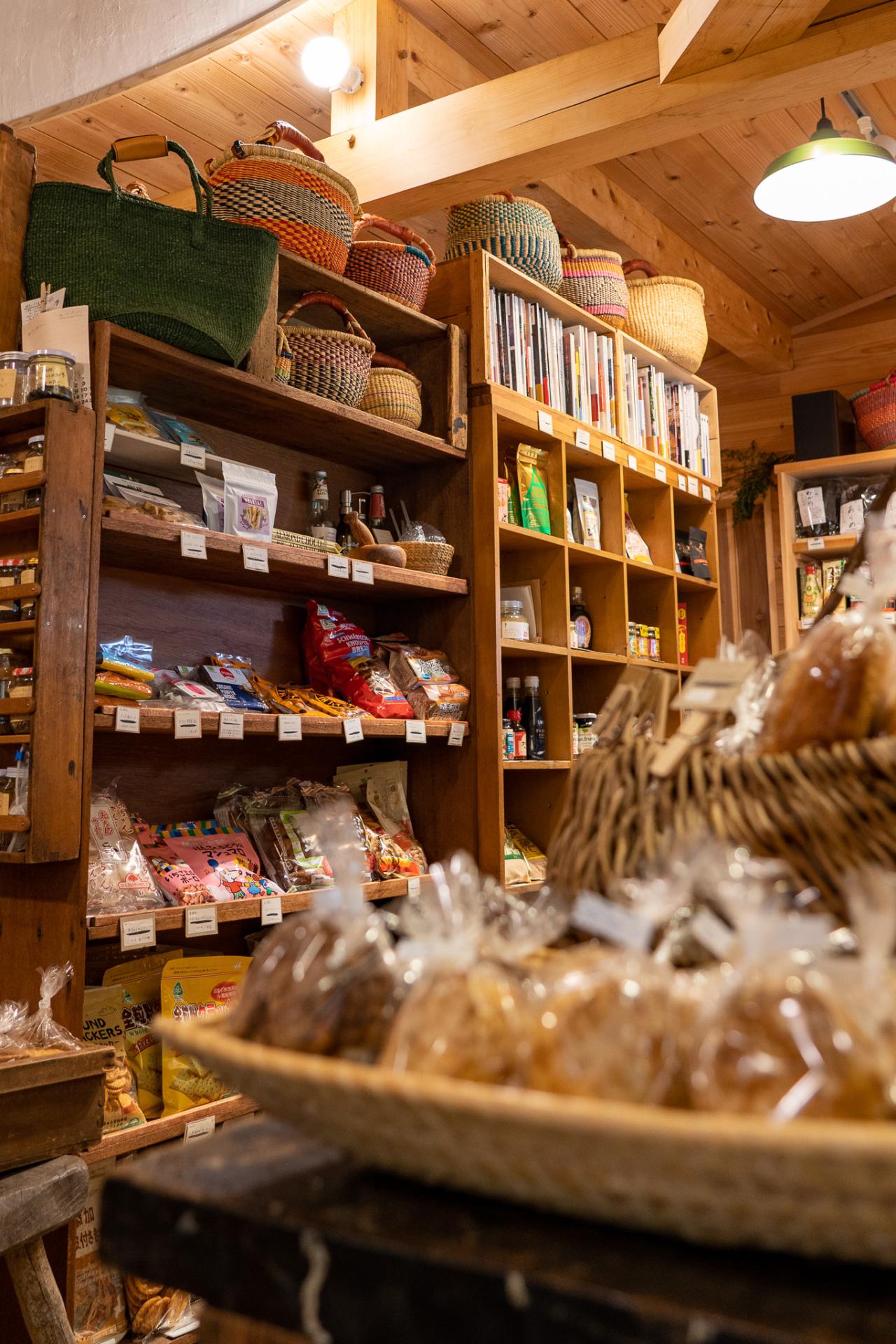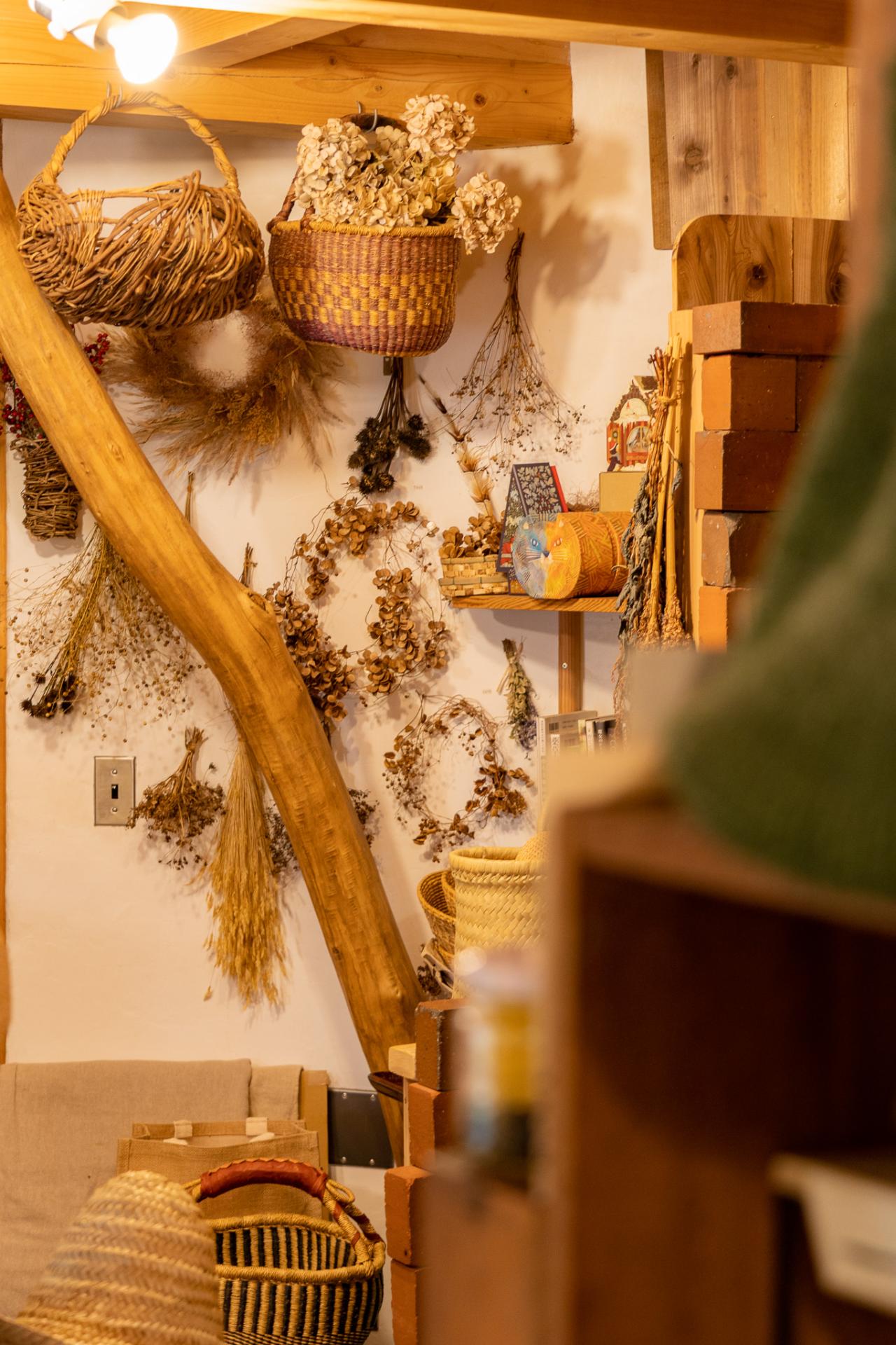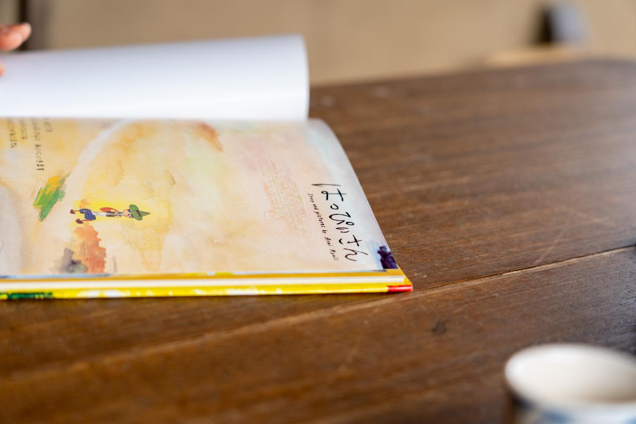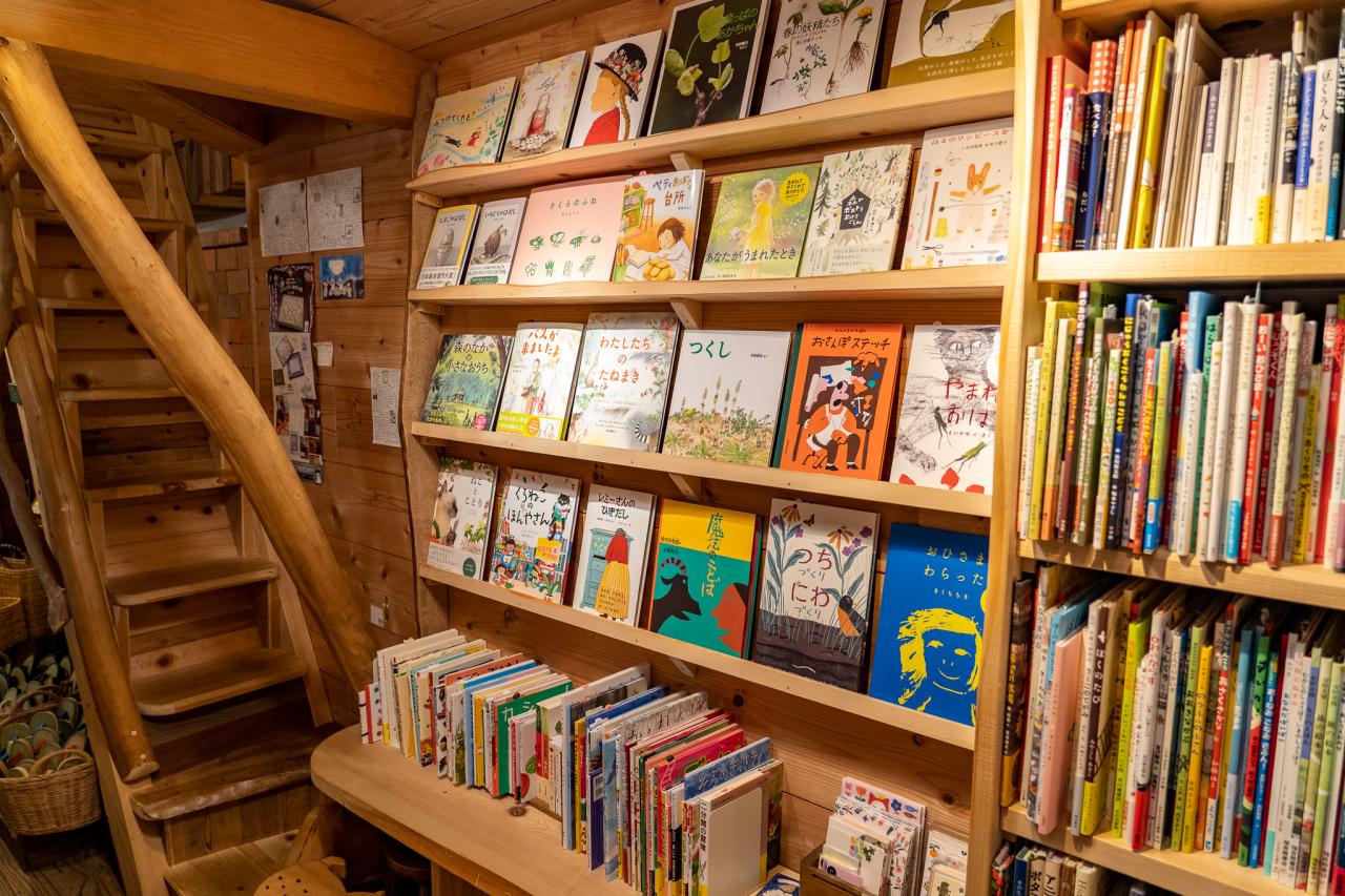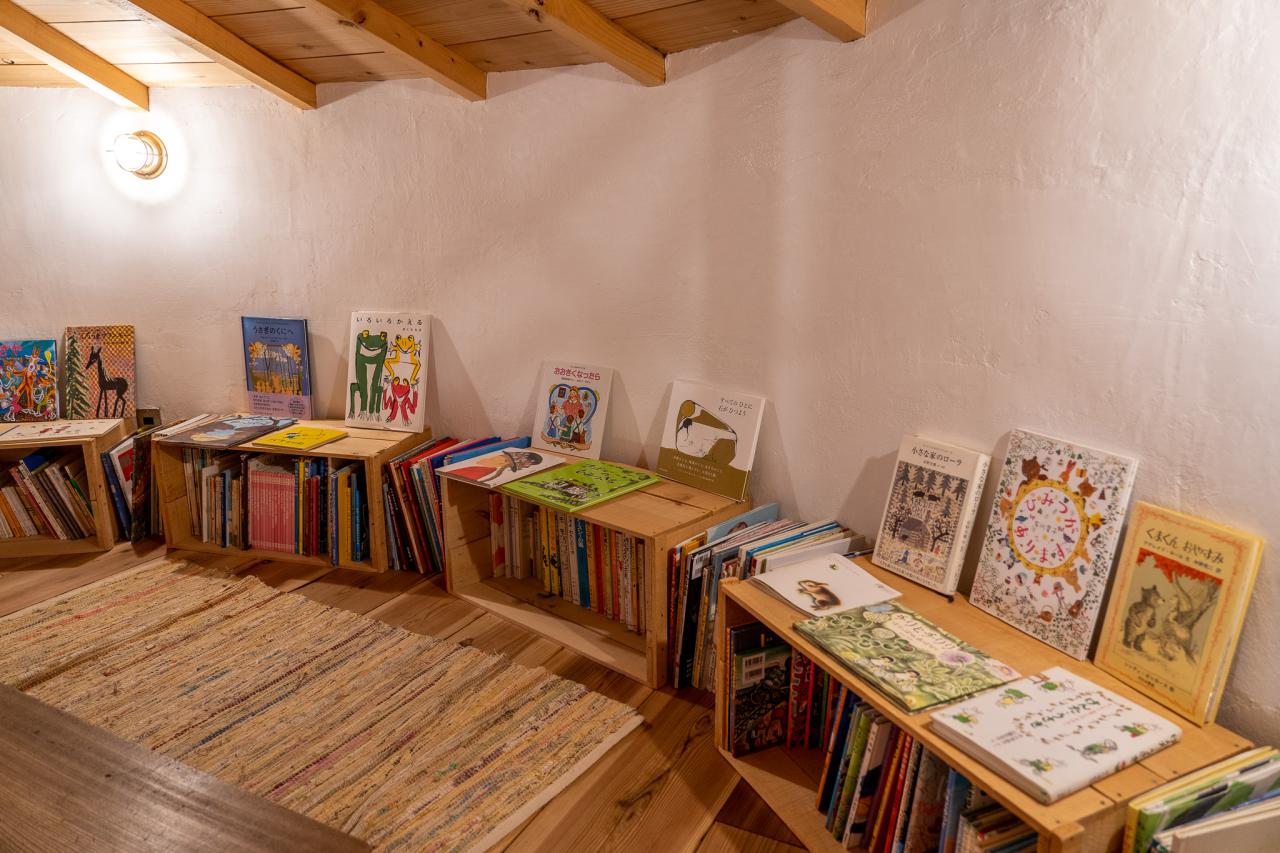 「夫が友人から、森の利用について相談されたことがきっかけでした。その森に家を建ててもよいと言ってもらったので、移住を決めました」。森の一部だった場所を開拓し、家とお店が完成するまで7年ほどかかったそう。「絵本の世界に出てくるような場所で、好きな絵本に出会える。そんなテーマでお店を建てました。私たちはパーマカルチャーの考え方を取り入れて暮らしているので、それをお店でも実践して体感してもらえたらと思っています」。基礎にコンクリートを使わない石場建て、板を重ねていくシダーシェイクのとんがり屋根や外壁、土壁、草屋根、バイオトイレなど、人と自然の共生を意識したパーマカルチャーの考え方が随所に見られる。どこか懐かしいような、それでいて非日常なような、まさに絵本の世界に触れられるような佇まい。店内に入ると、木材やハーブの香りも感じられ、心が落ち着く空間となっている。