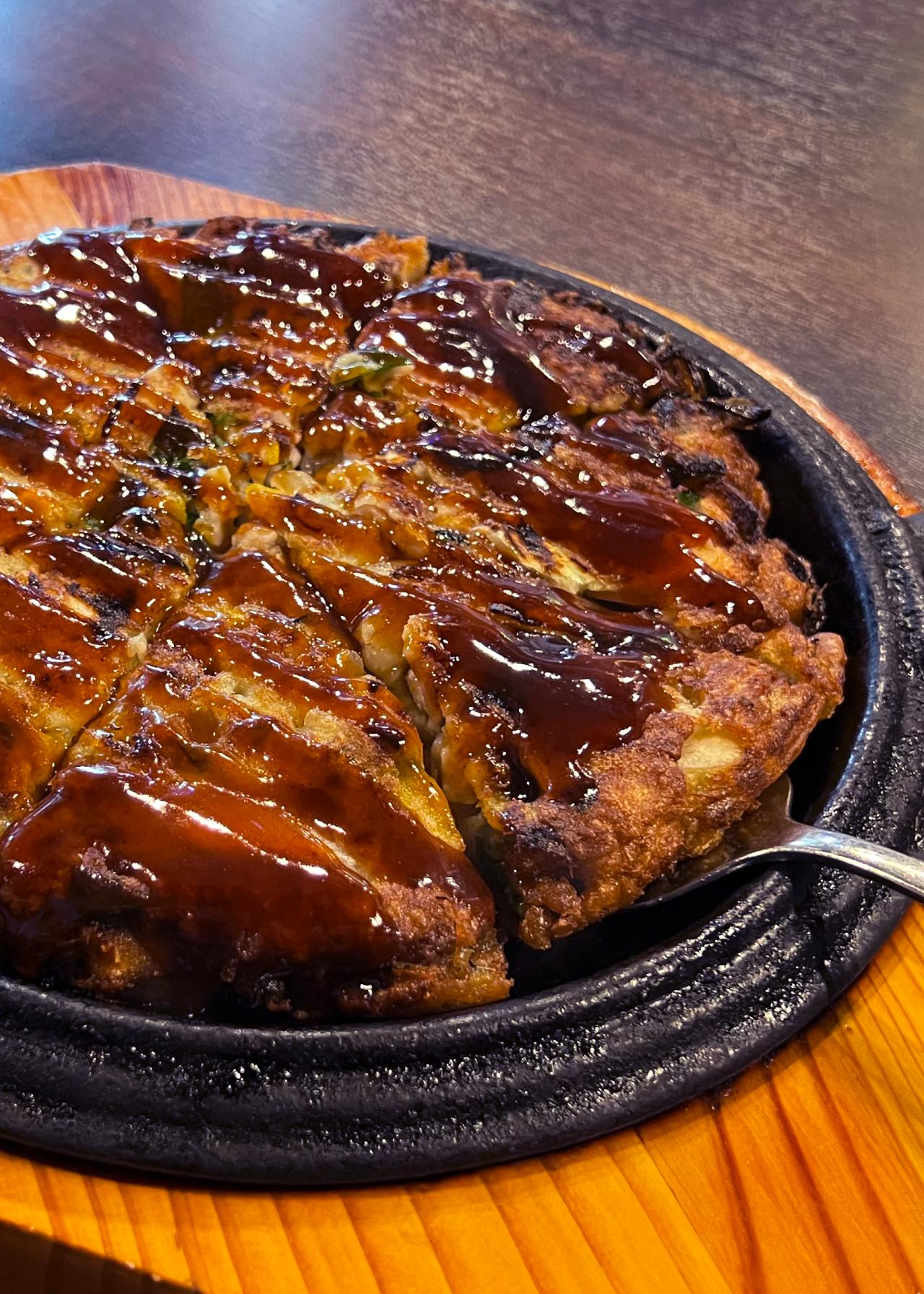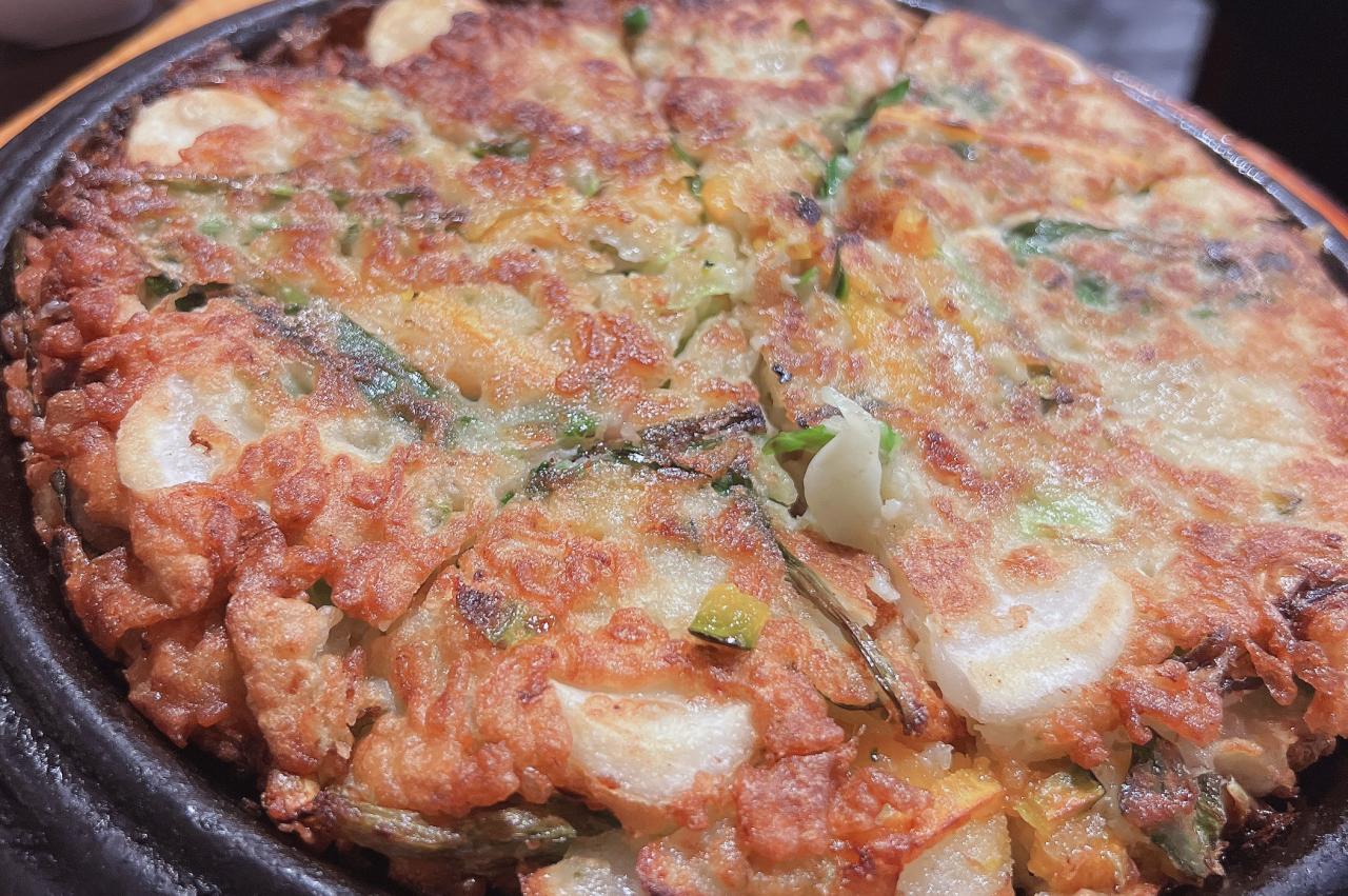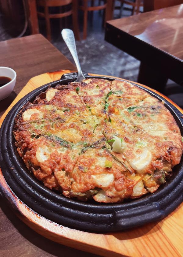 鉄板に乗ったアツアツのチヂミは厚みがあり、かなり大きめサイズです。外はカリカリで中はもちもち。一切れがとっても大きく、沢山の野菜に加えてトックも入ってることもあり、かなり食べ応えがあります。さすが、“王様”というのも納得の美味しさとボリュームです!