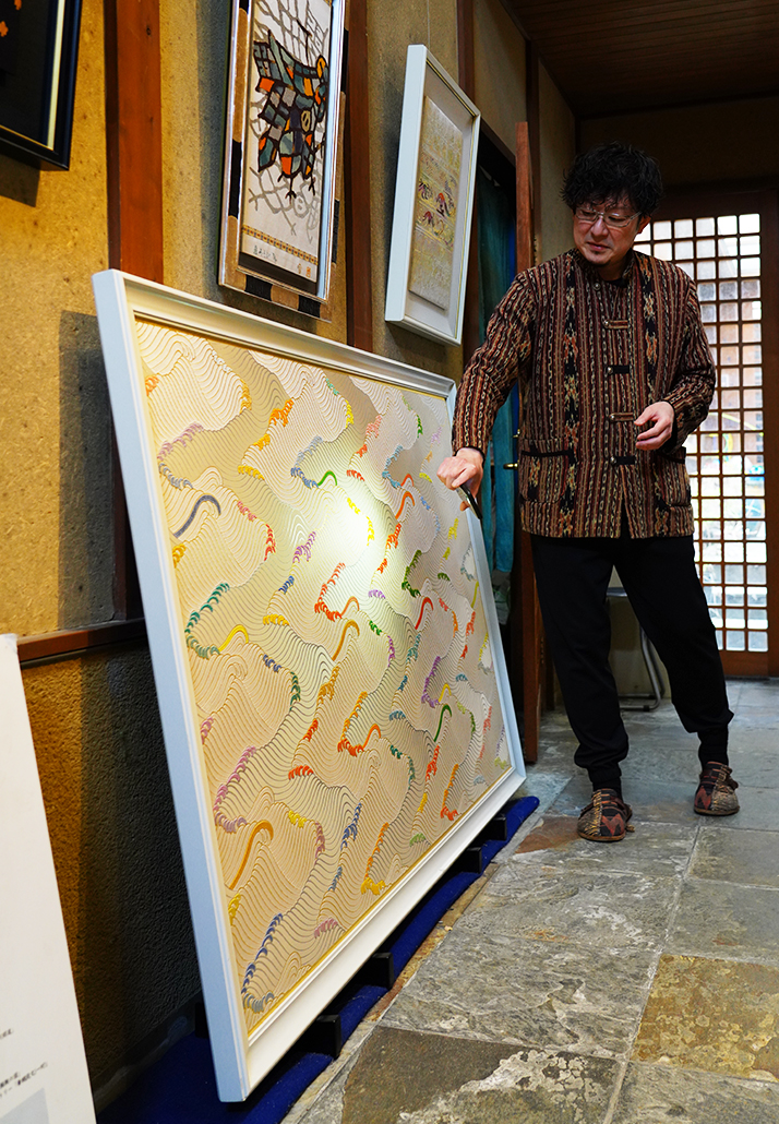 周さんの父である龍村光峯さんの名前を冠したのが〈光峯錦織工房〉。釘を使わない伝統的な技法で宮大工によって建てられた工房で、入口付近は代々の錦織美術作品を飾るギャラリーになっている。どれも織物とは思えないほど繊細で、まるで絵画のような美しさを感じる。作品の解説を聴きながら、じっくりと鑑賞をおすすめしたい。