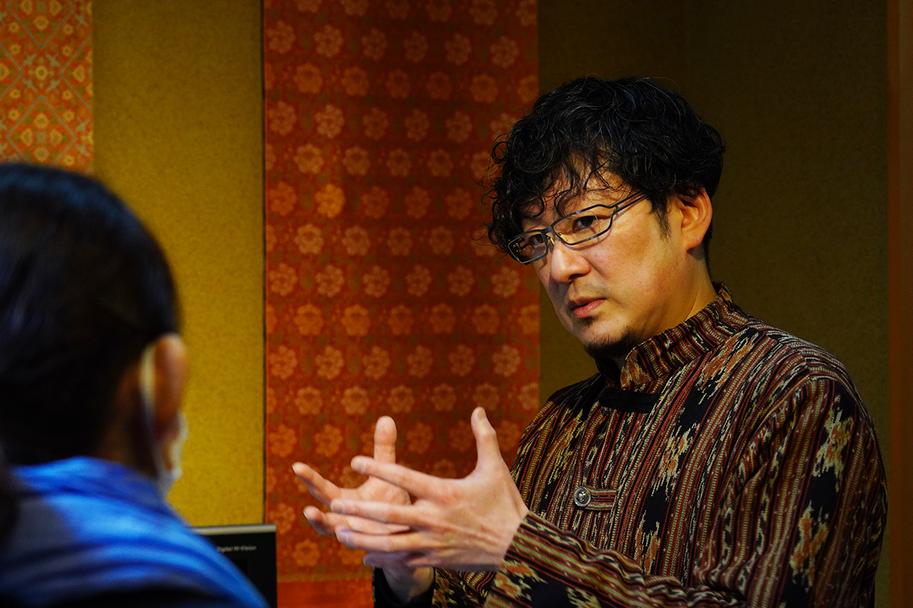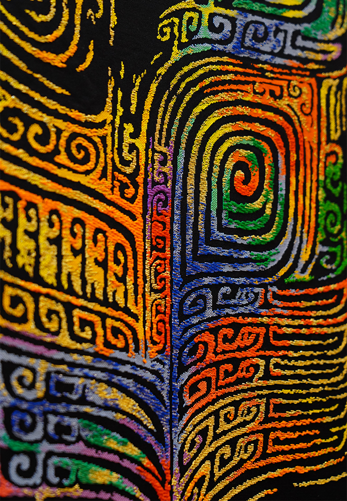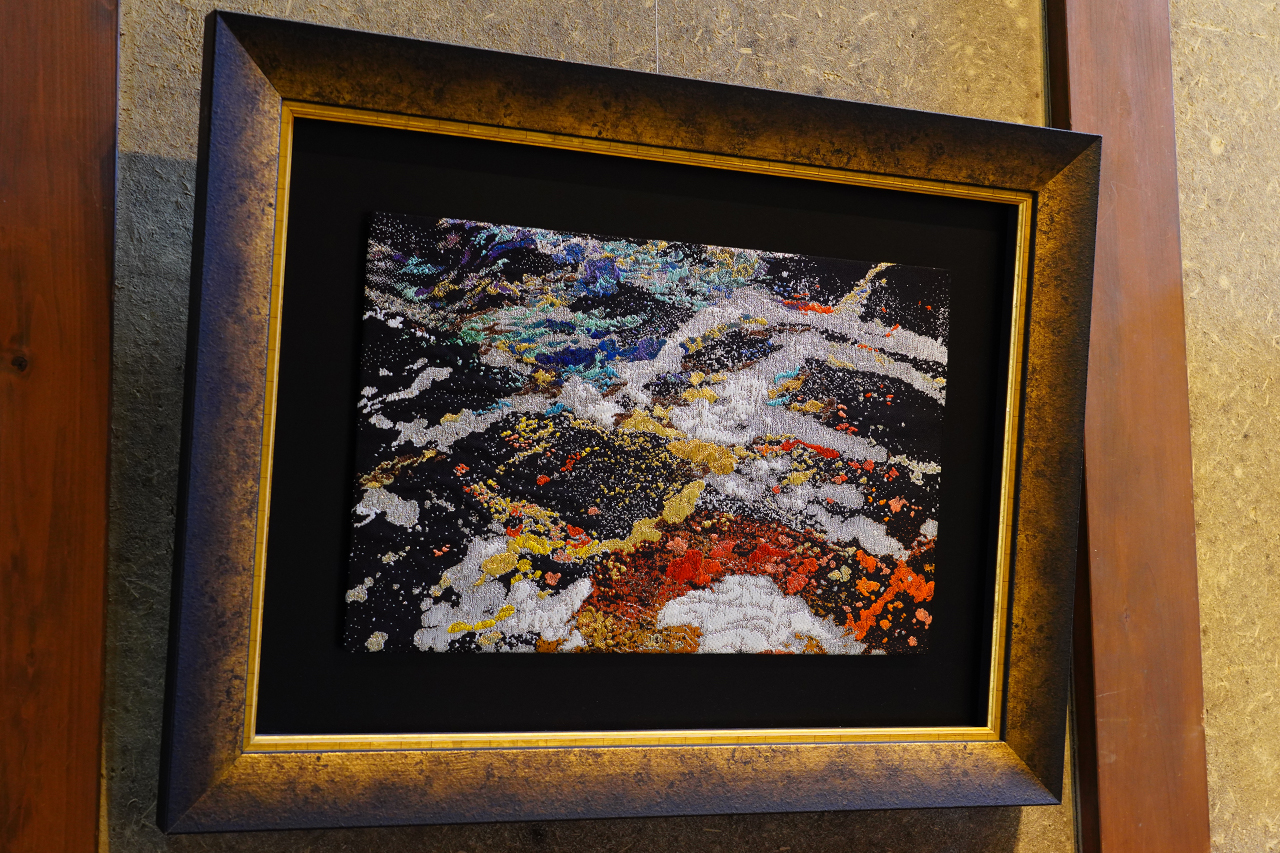 「もうひとつ見ていただきたいのが、織物の立体感です」と周さん。近づいて見ると、確かに平面ではなく、糸が立体的に織り込まれている。錦織は完成までに70以上の工程を要するが、最初に図案を考える段階で三次元を意識しているそう。あらためて、1本の糸から作り上げる錦織の美の奥深さに感嘆した。