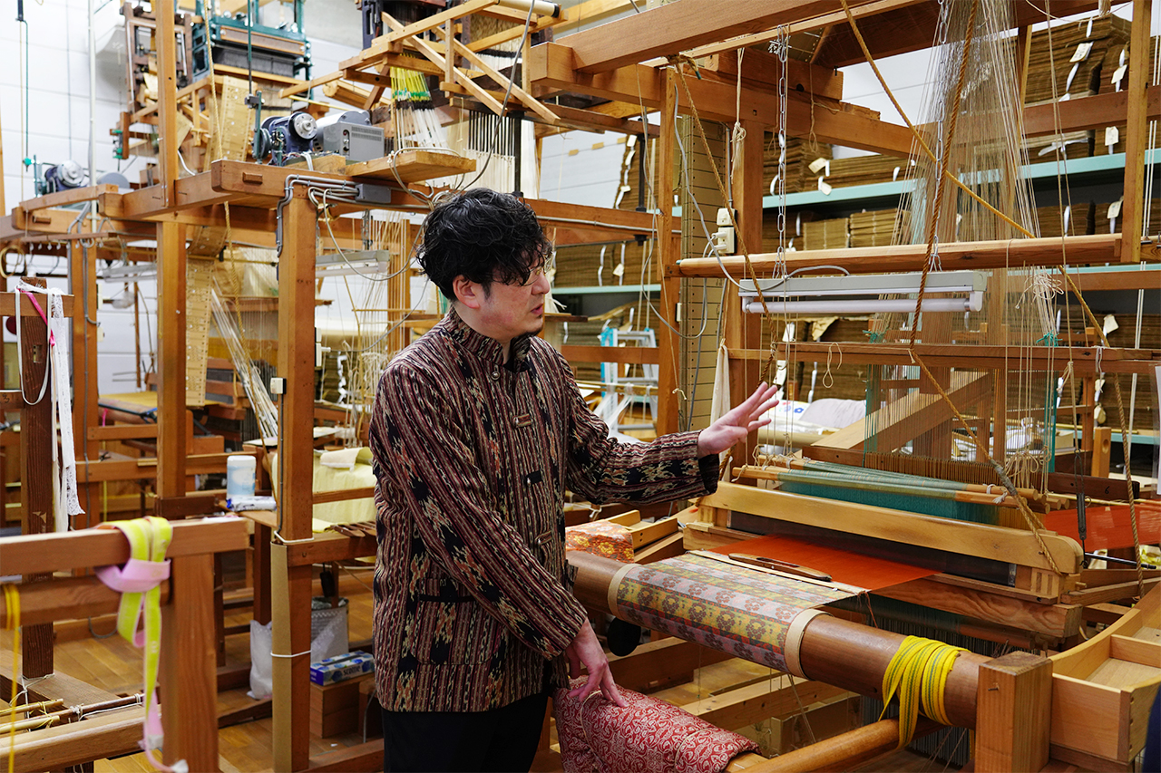 まず工房見学へ。今回は当代の龍村周(あまね)さんにご案内いただいた。龍村という名字にピンときた方がいるかもしれない。初代は古代織物の復原に尽力した龍村平蔵さんだ。初代の次男であり、後継者となったのが二代目平蔵さん、周さんの祖父にあたる。