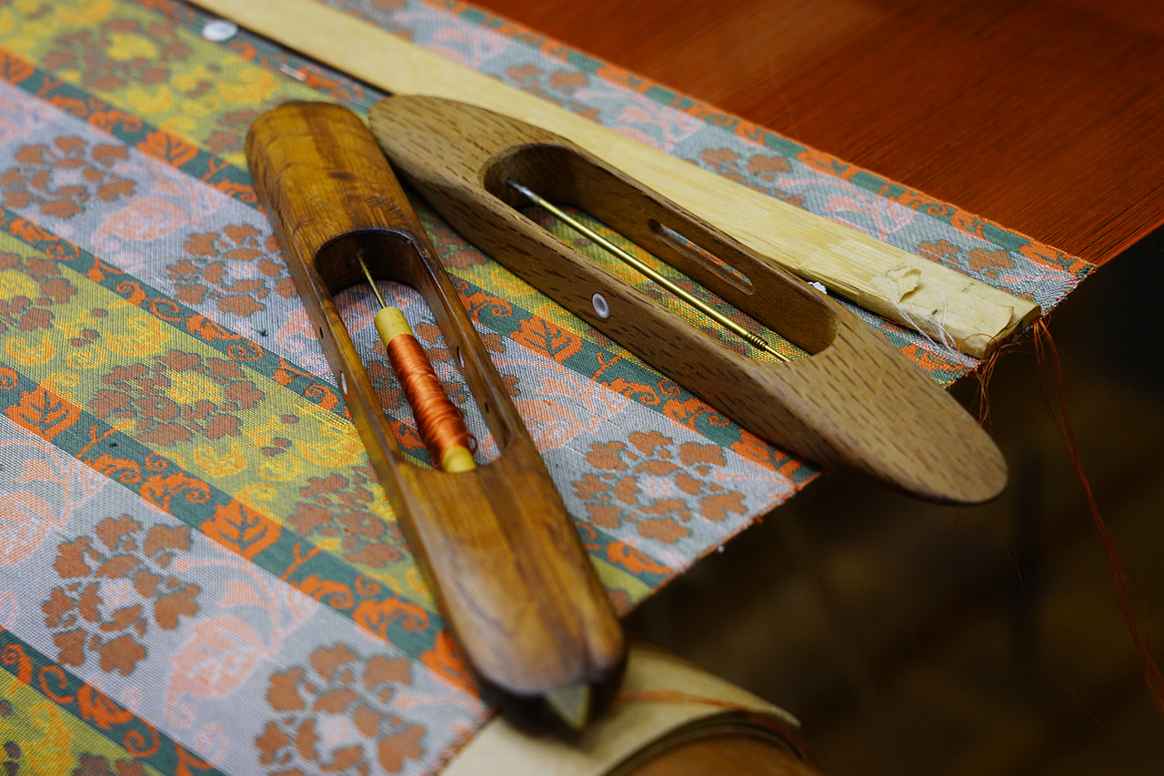 シャトルとも呼ばれ、経糸の間に緯糸を通すために左右に動かして使う。伝統的な「杼」は宮崎県の赤樫の木で出来ていて、いまや製作できるのは京都の職人、ただひとり。「分業制で成り立っている織物は、ひとつが欠けたら成り立ちません」と周さんは語る。