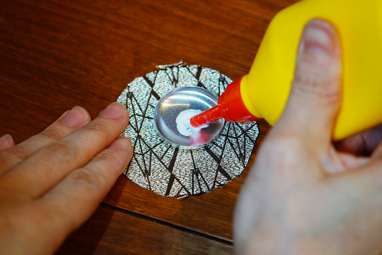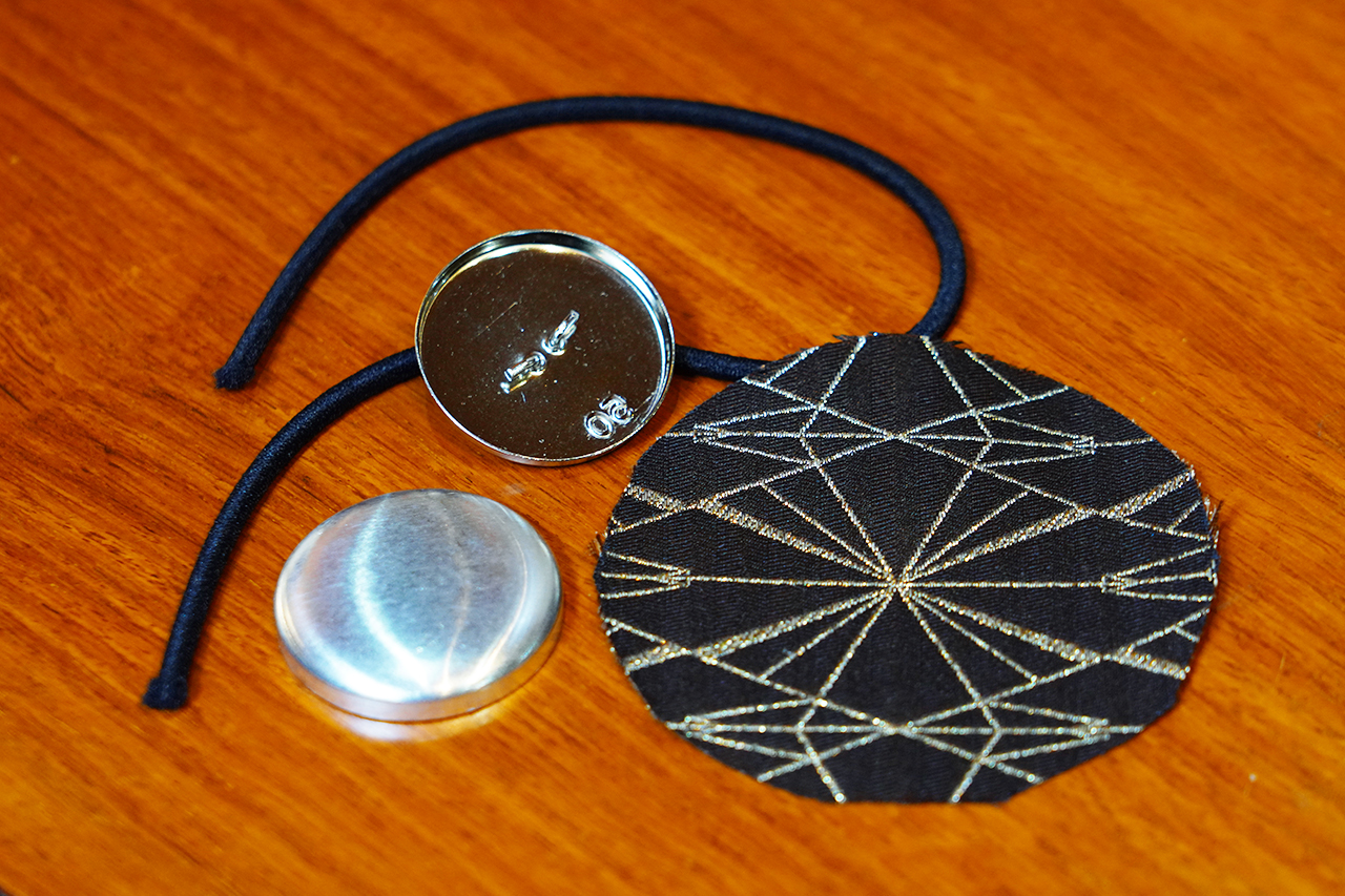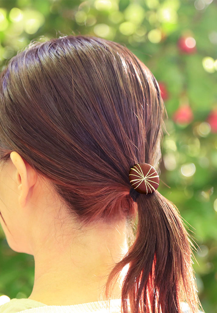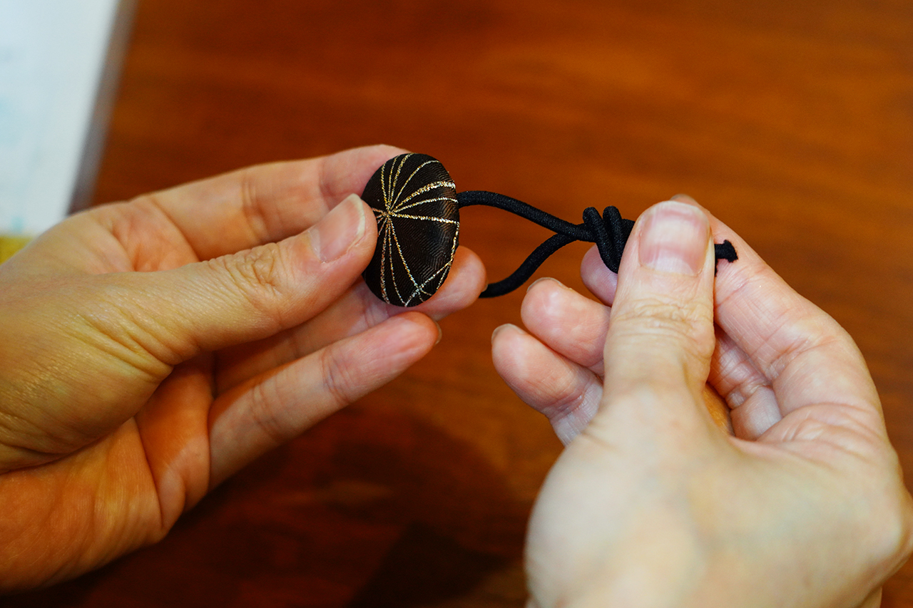 通し穴のついたフタをかぶせ、ゴムを結べば完成。太陽の光を受けてキラリと光る錦織の髪留めは、ちょっとした自慢だ。