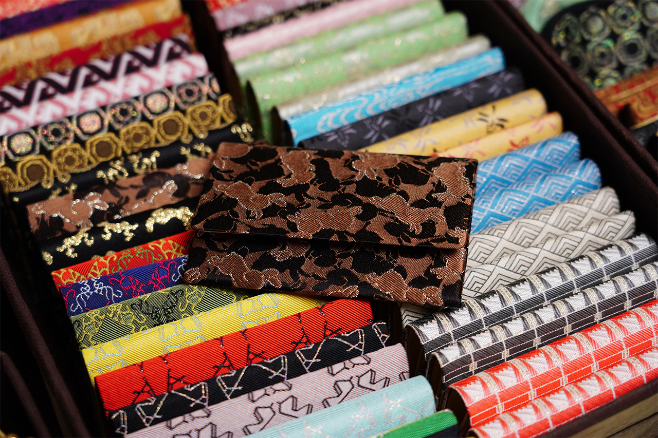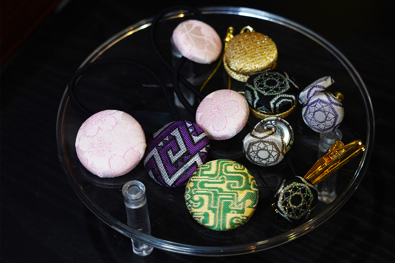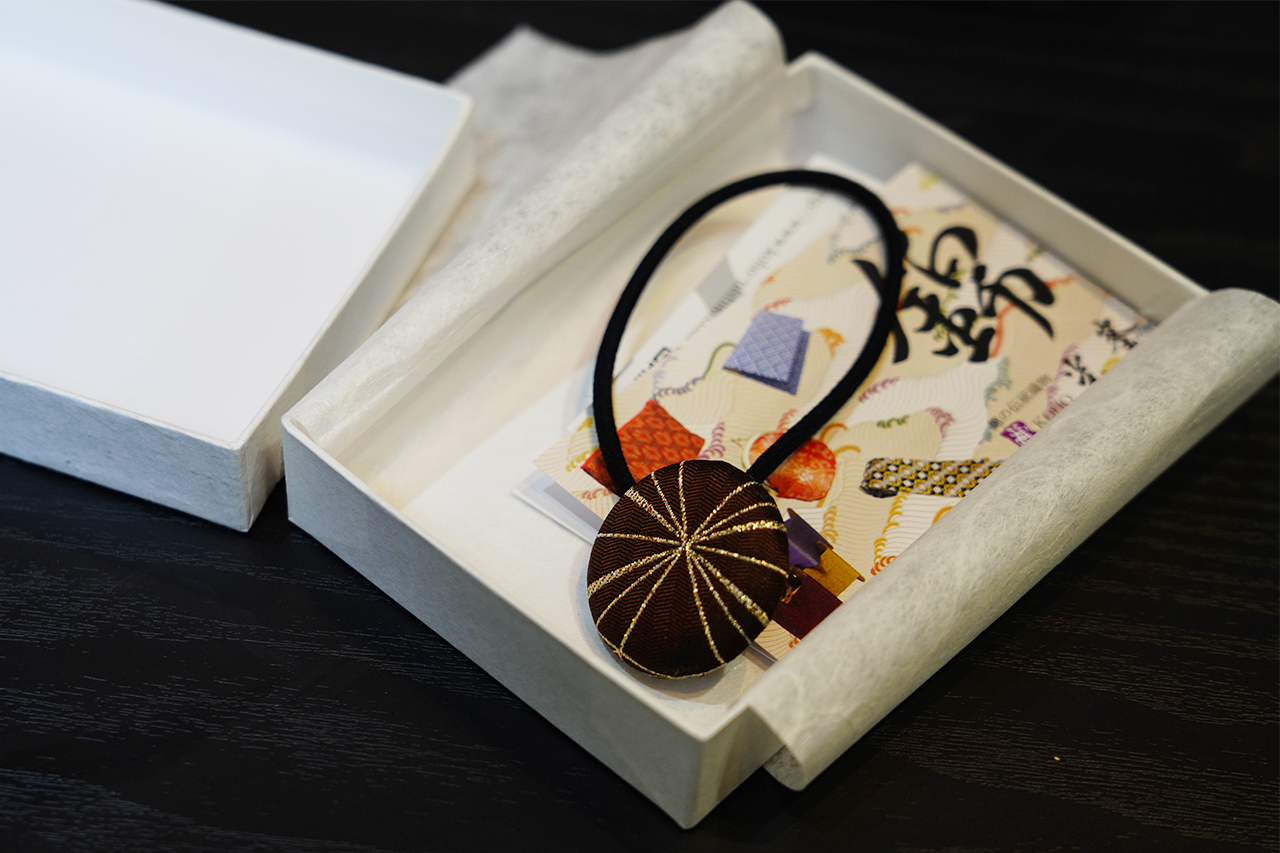 〈光峯錦織工房〉では、着物の帯や錦織美術作品以外に、普段使いできる小物も制作している。その端布をいかして、誰でも簡単に錦織に親しめるようにと考案されたのがアクセサリー作りだ。